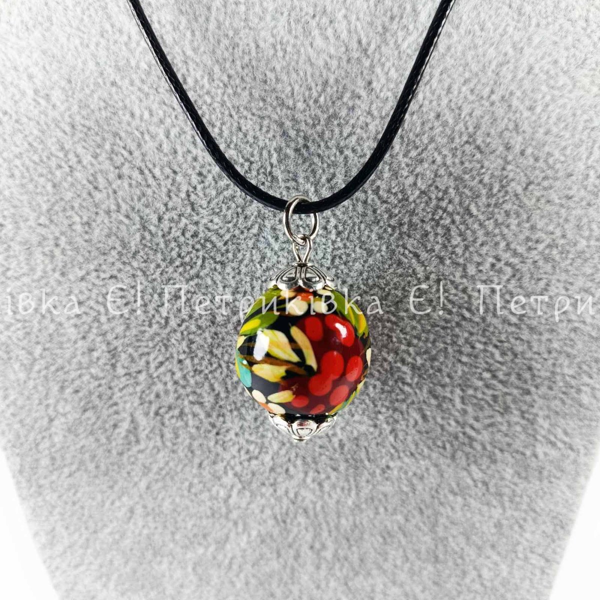 Кулон з Петриківським розписом. Намистина з бука, якісна фурнітура. Розпис виконано гуашшю. Два шари глянцевого лаку
