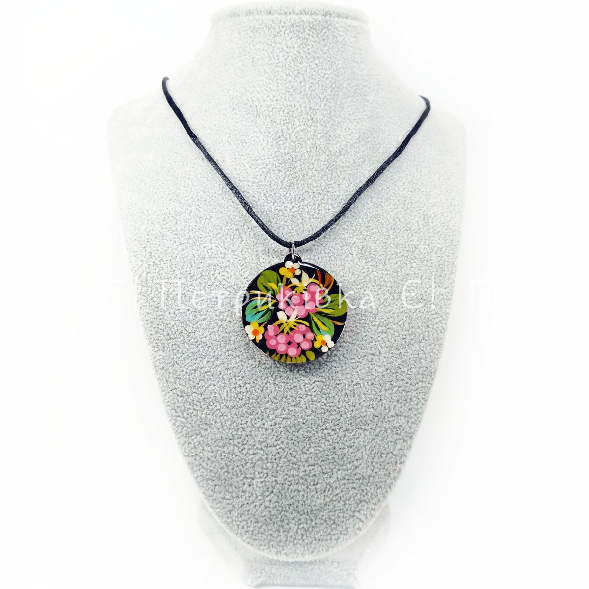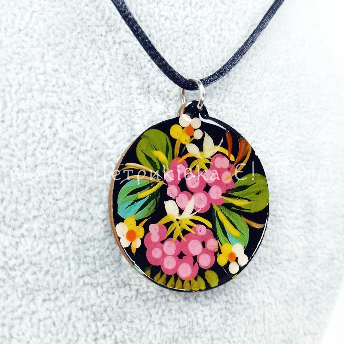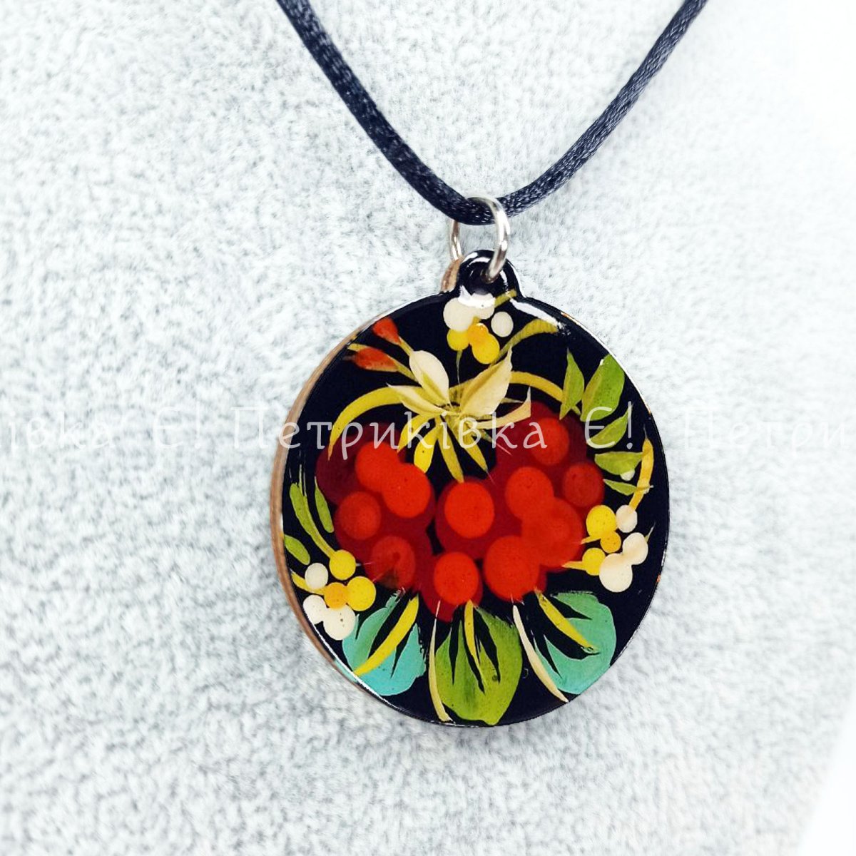 Кулон круглий Петриківський розпис "Калина червона та рожева" двосторонній