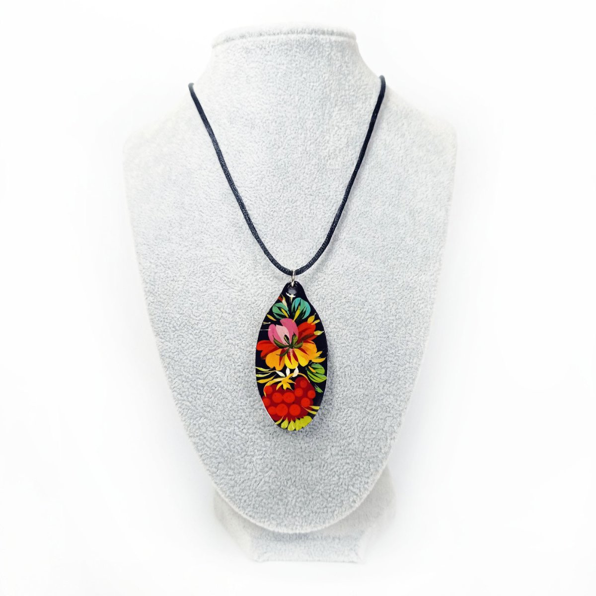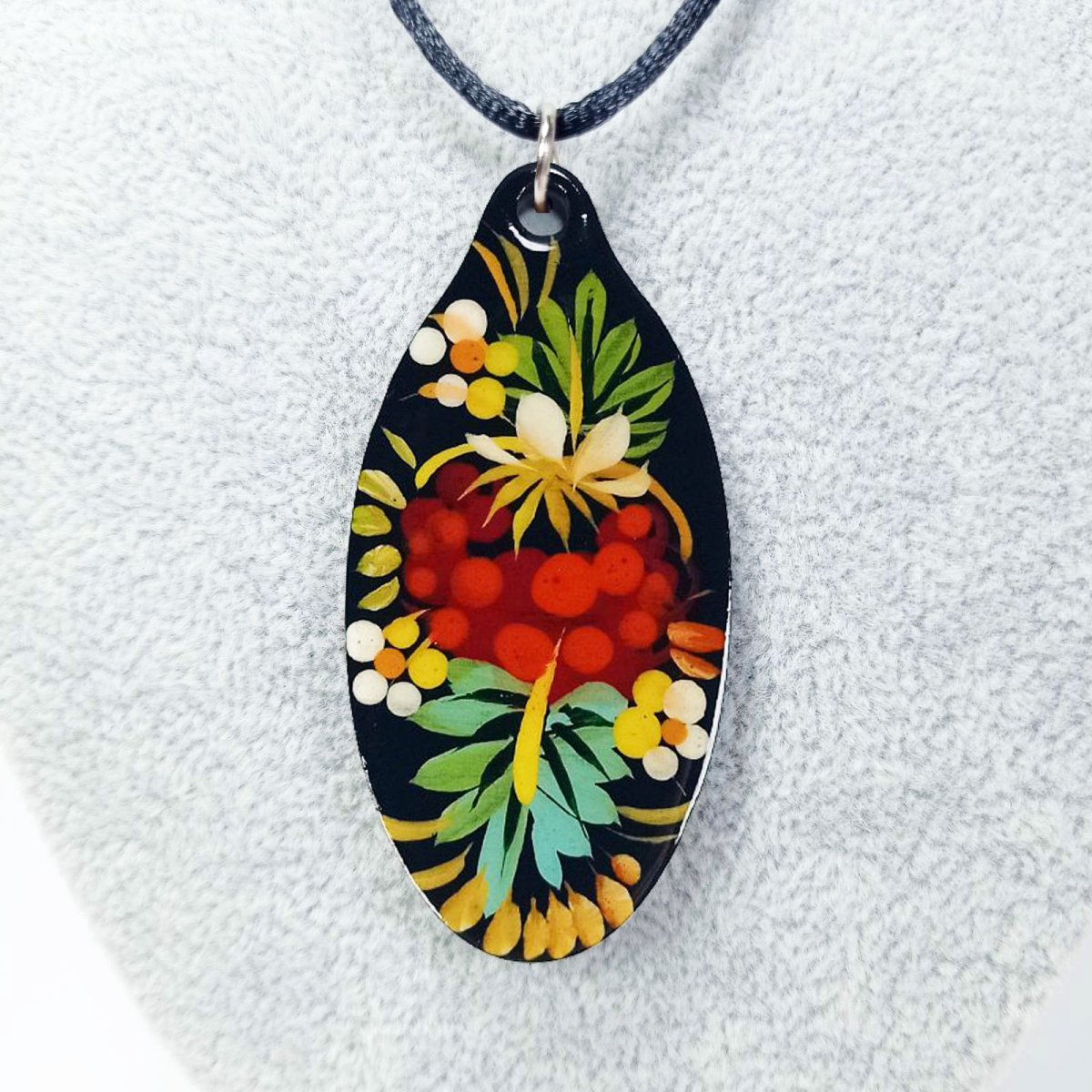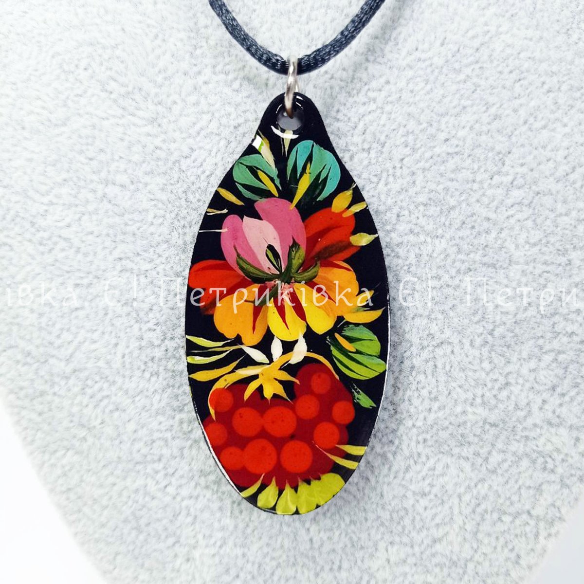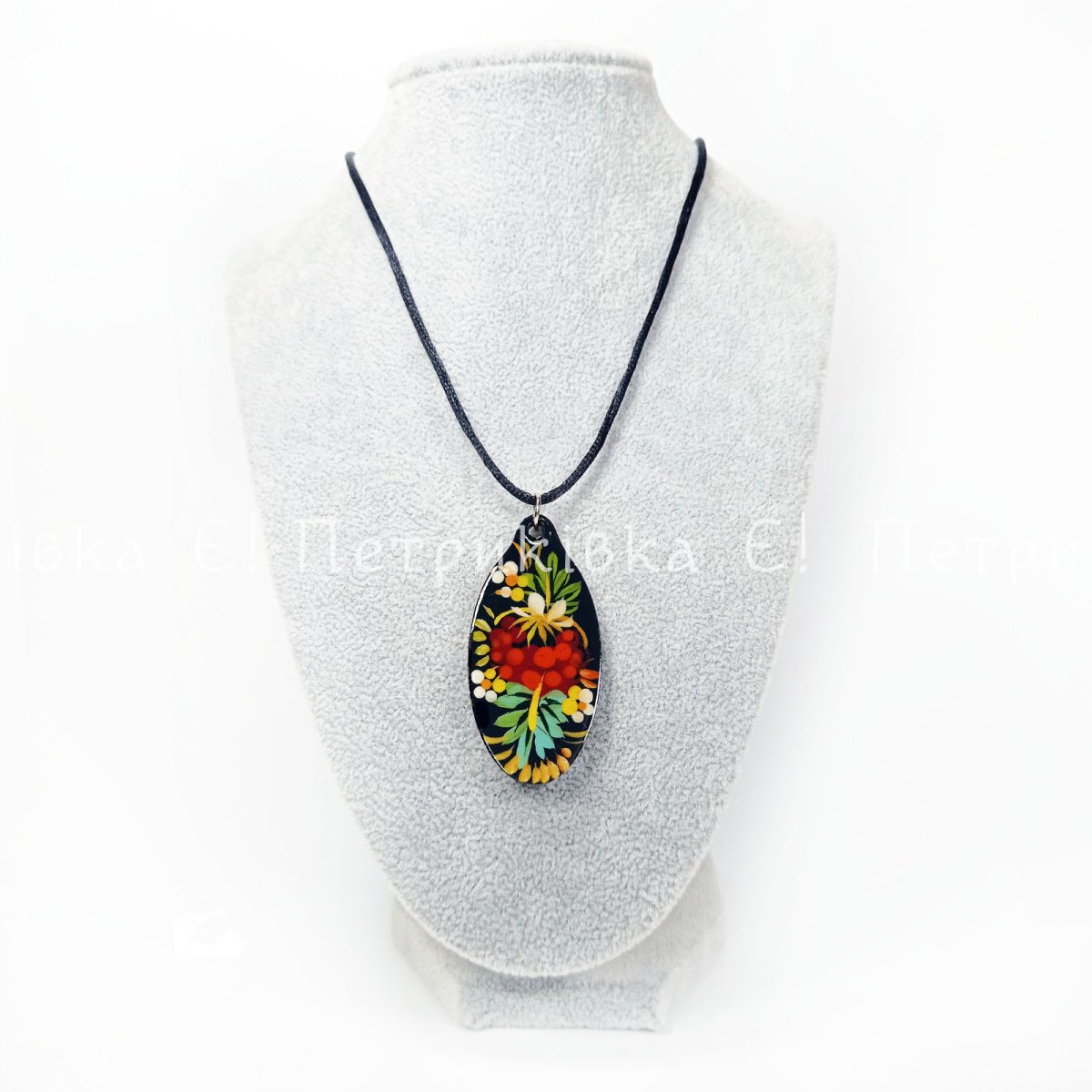 Кулон овальний з Петриківським розписом "Калина з квіточкою". Двосторонній розпис