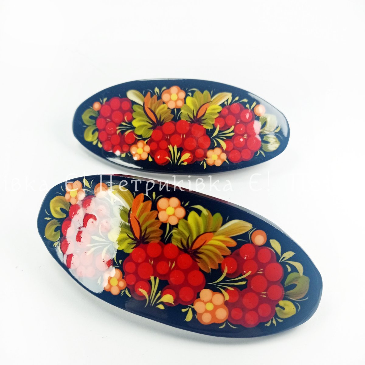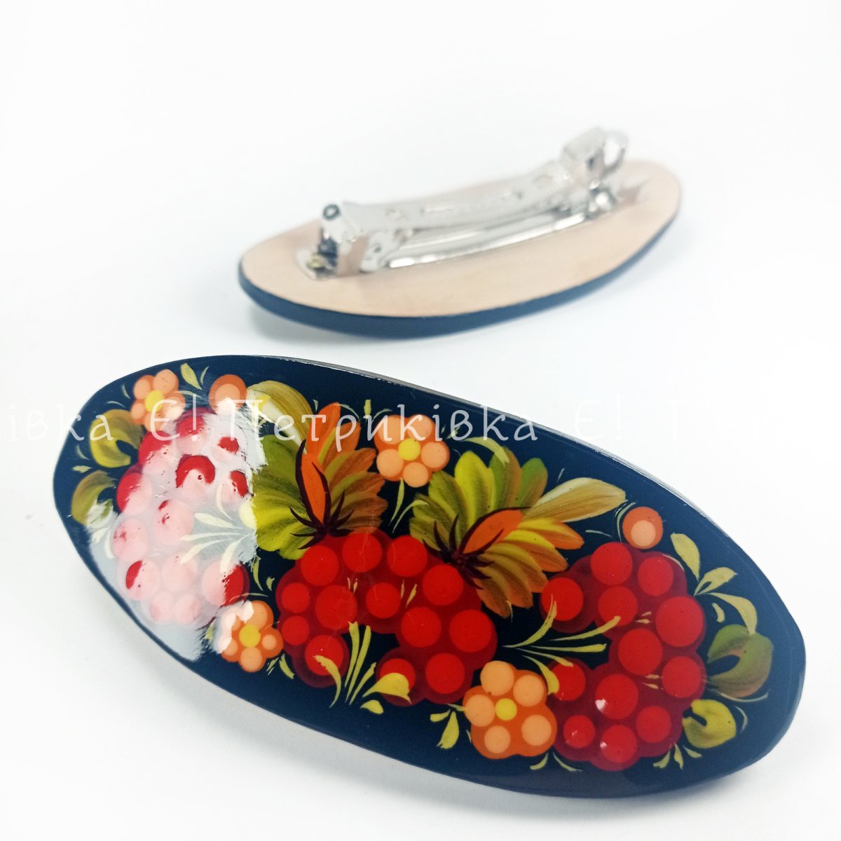 Заколка-автомат для волосся декоративна. Три різновиди форми. Матеріал - деревина листяних порід. Якісна фурнитура. Довжина - 10 см, ширина - 4,2 см. Петриківський розпис виконано гуашшю, три шари глянцевого лака