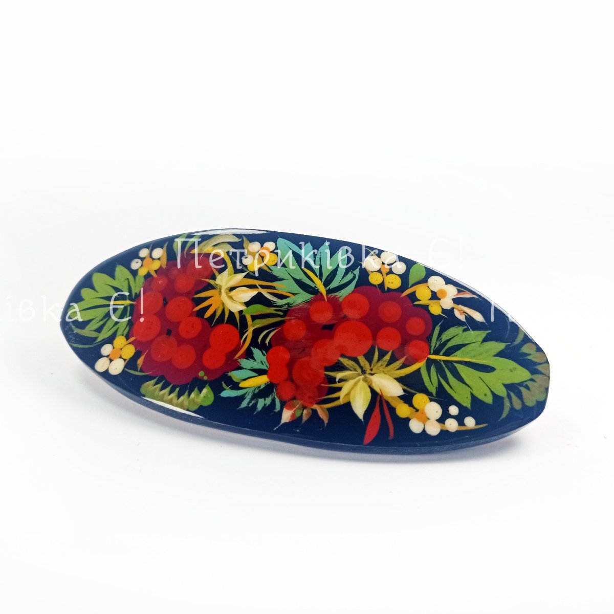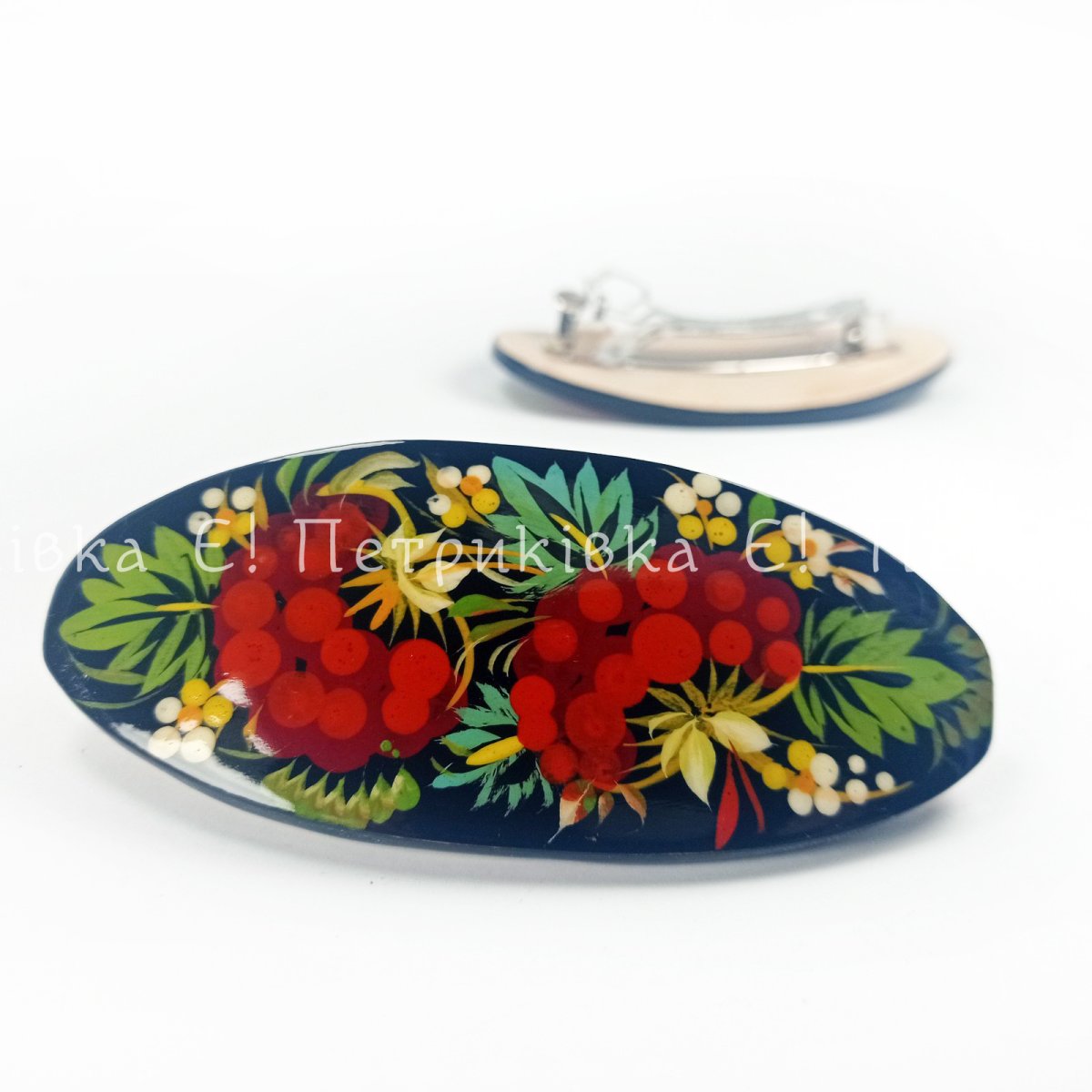 Заколка-автомат для волосся декоративна. Три різновиди форми. Матеріал - деревина листяних порід. Якісна фурнитура. Довжина - 10 см, ширина - 4,2 см. Петриківський розпис виконано гуашшю, три шари глянцевого лака