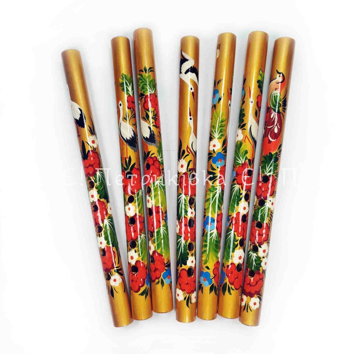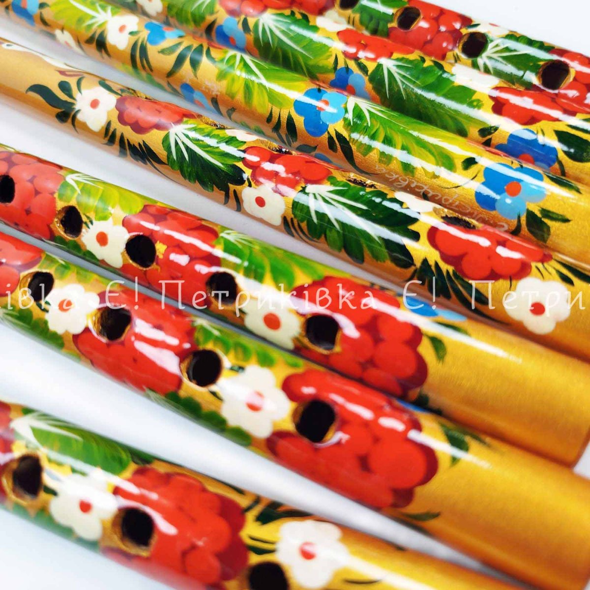 Сопілка з Петриківським розписом. Довжина - 26 см. Зроблено з деревини ліщини. Розписано гуашшю, три шари глянцевого лаку