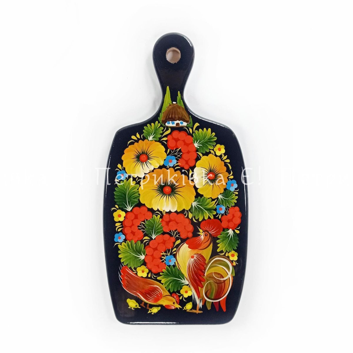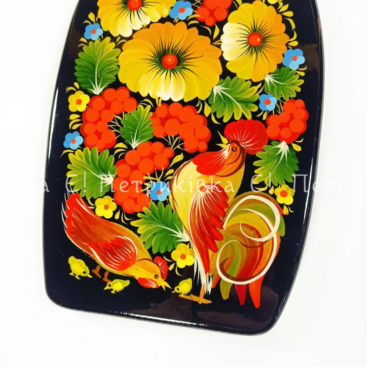 Дошка фігурна з ручкой з Петриківським розписом "Півник, курочка та курчата"