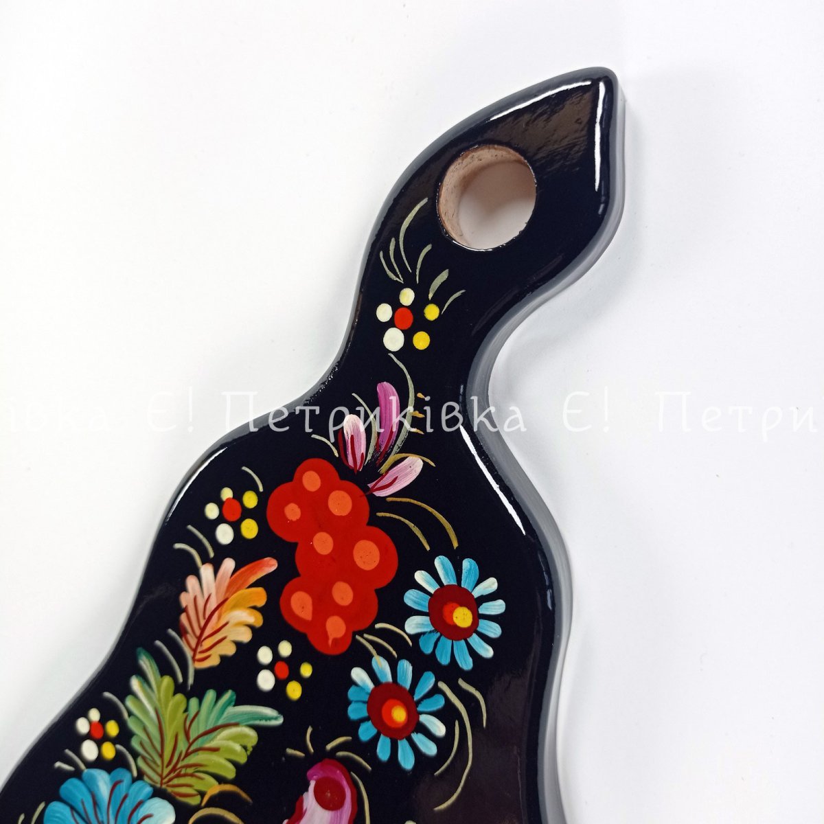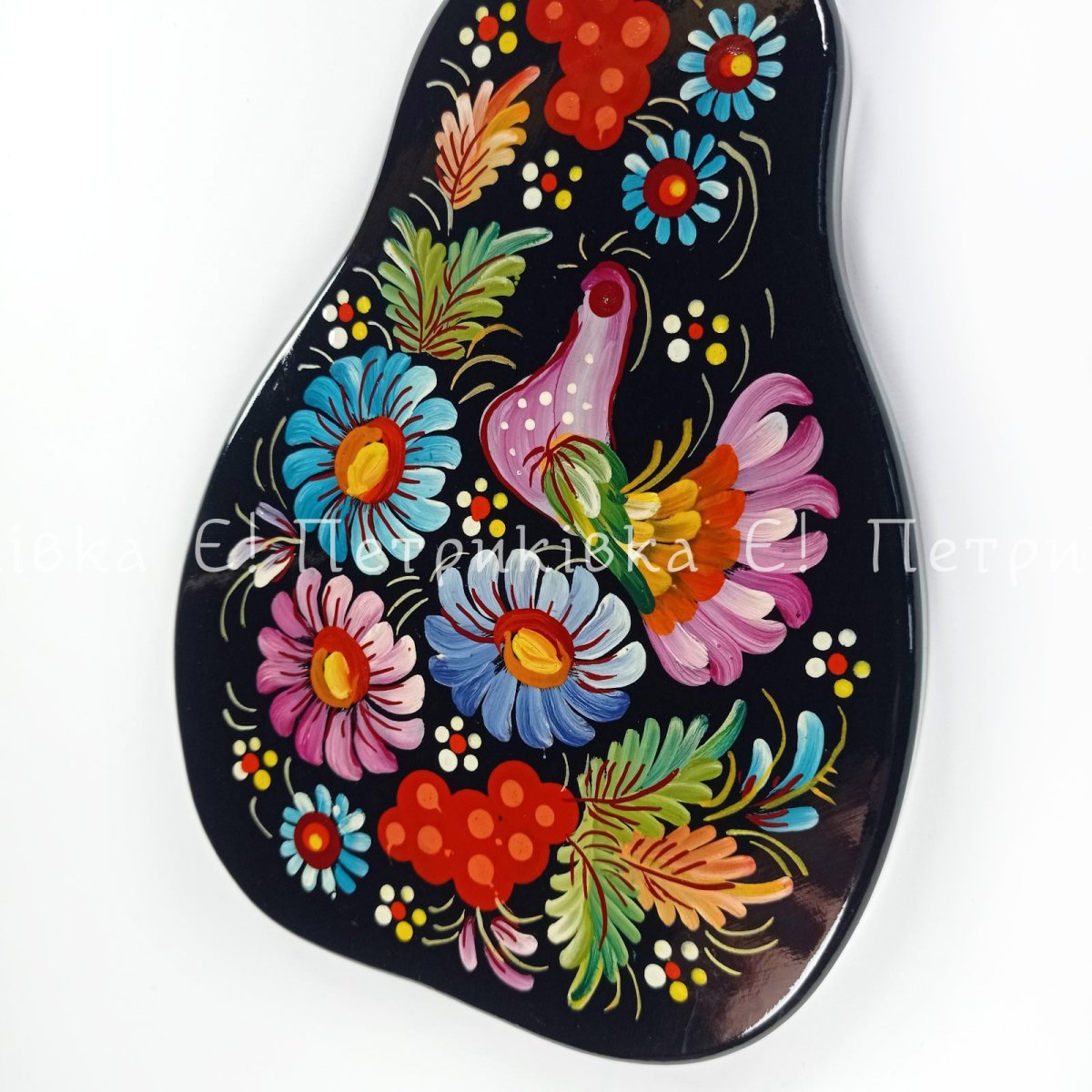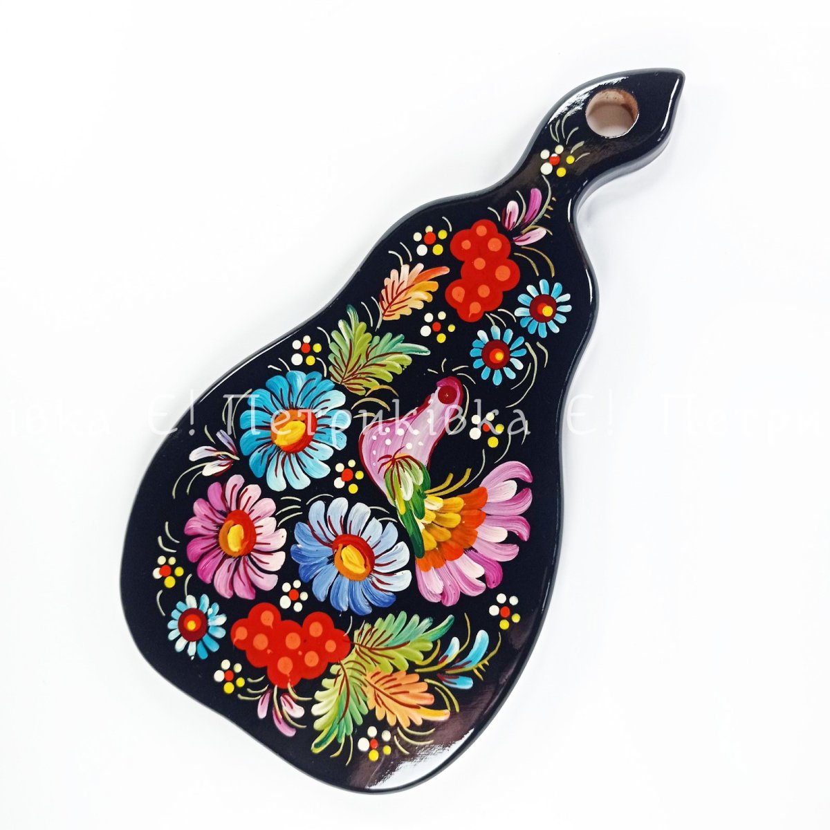 Дошка грушка мала (26х14 см) з Петриківським розписом "Пташка на чорному"