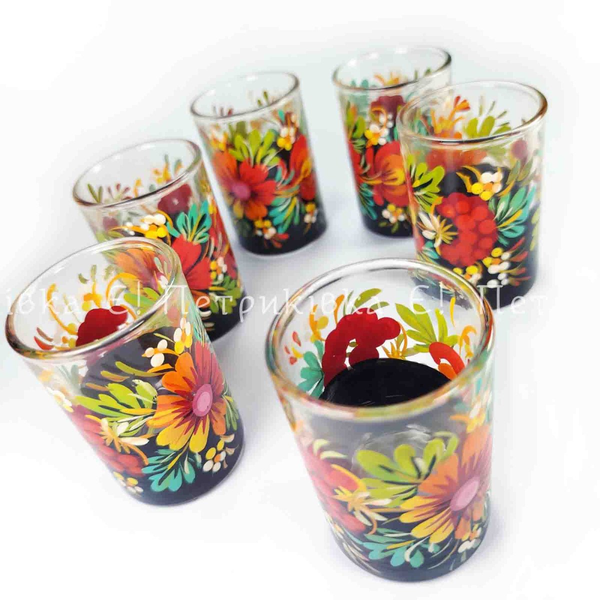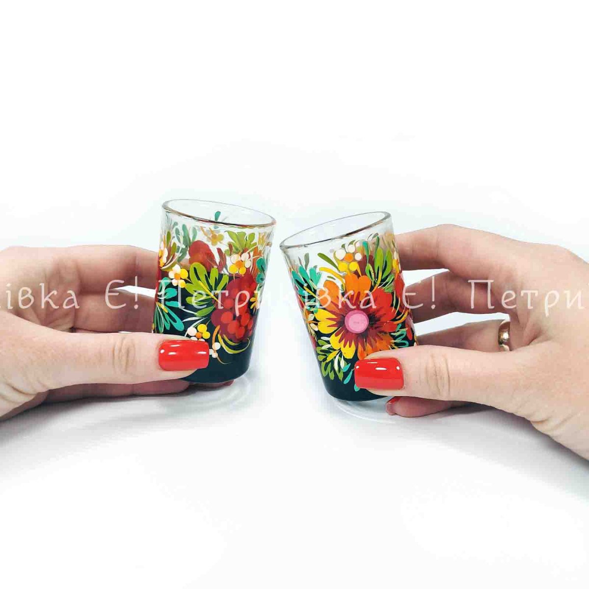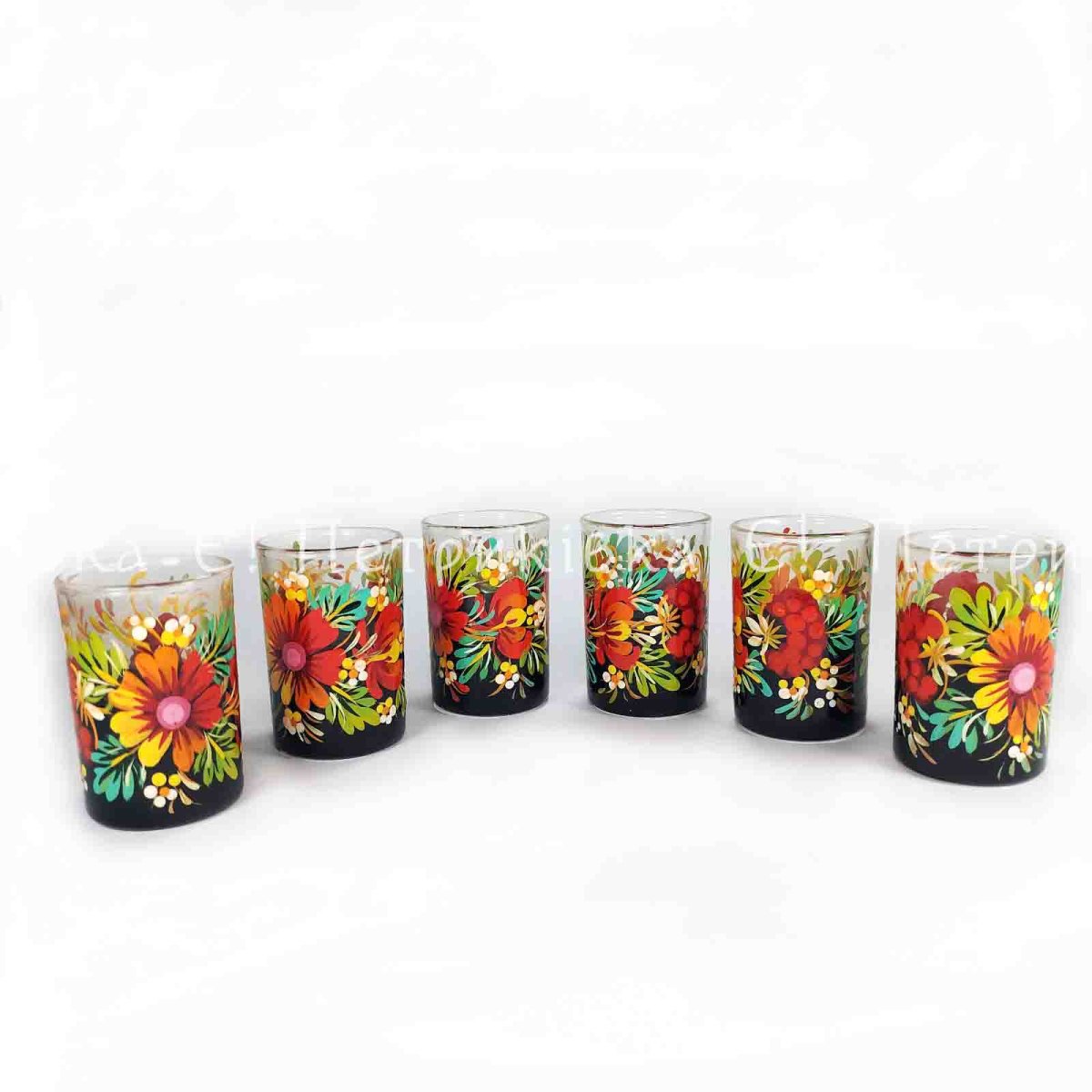 Набір з шести чарок. Чарки з високоякісного скла (об'єм - 57 мл). Петриківський розпис виконано гуашшю, три шари глянцевого лаку