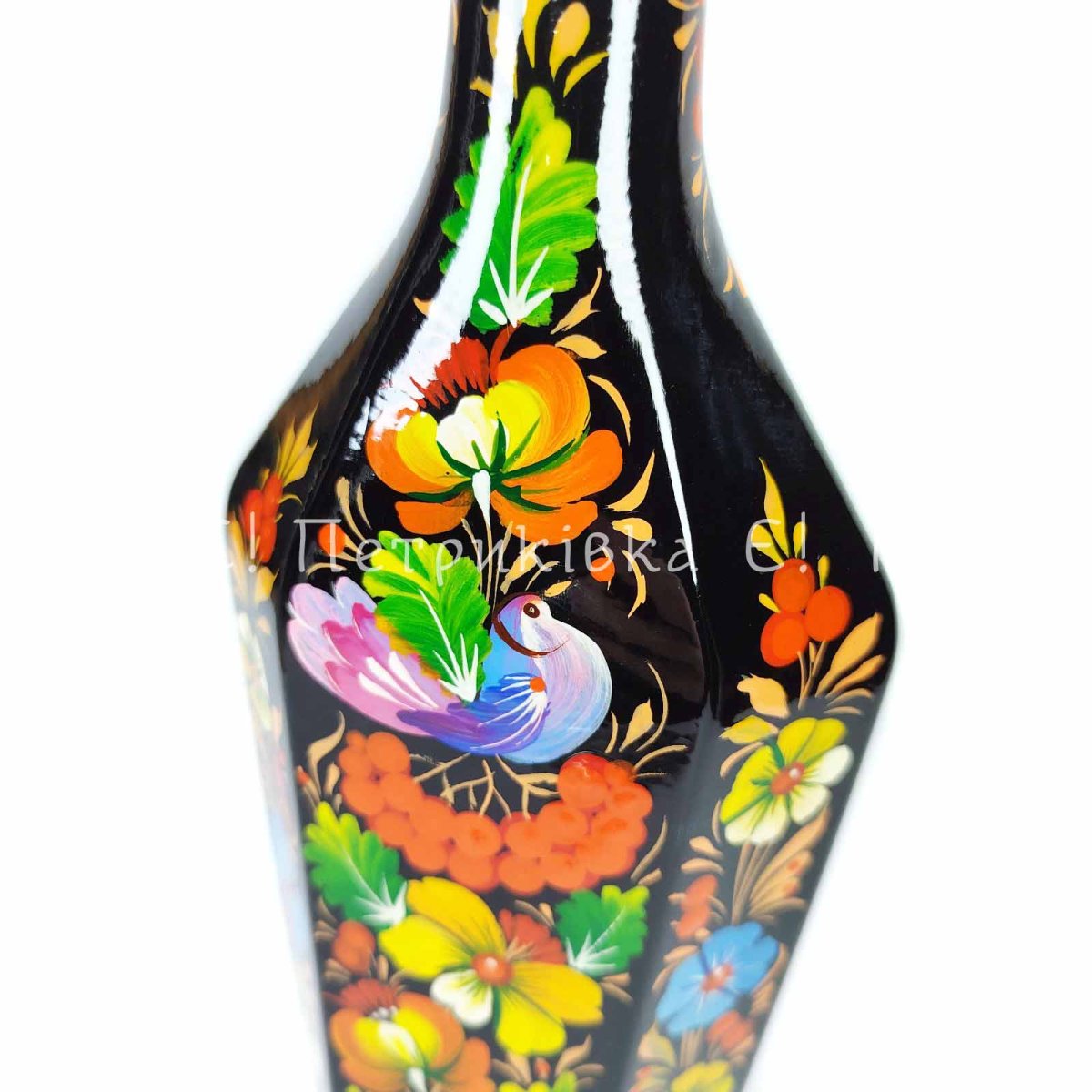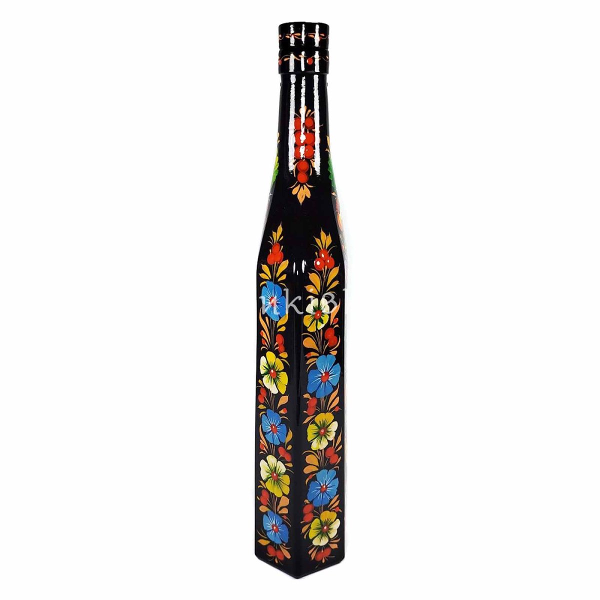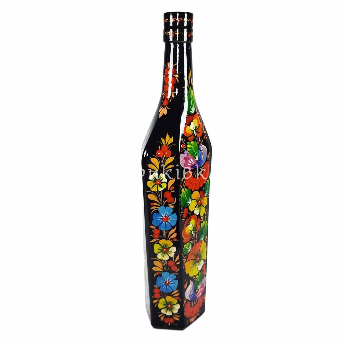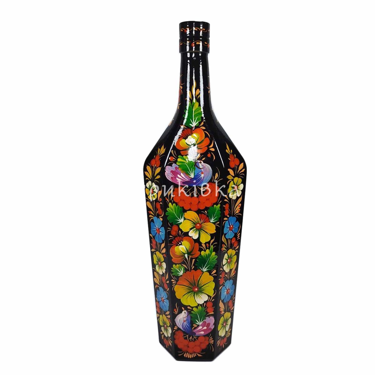 Пляшка розписана, об'єм 0,7 л, матеріал - скло. Висота - 33 см, ширина - 10 см., товщина - 5,5 см. Матеріал кришки - пробка