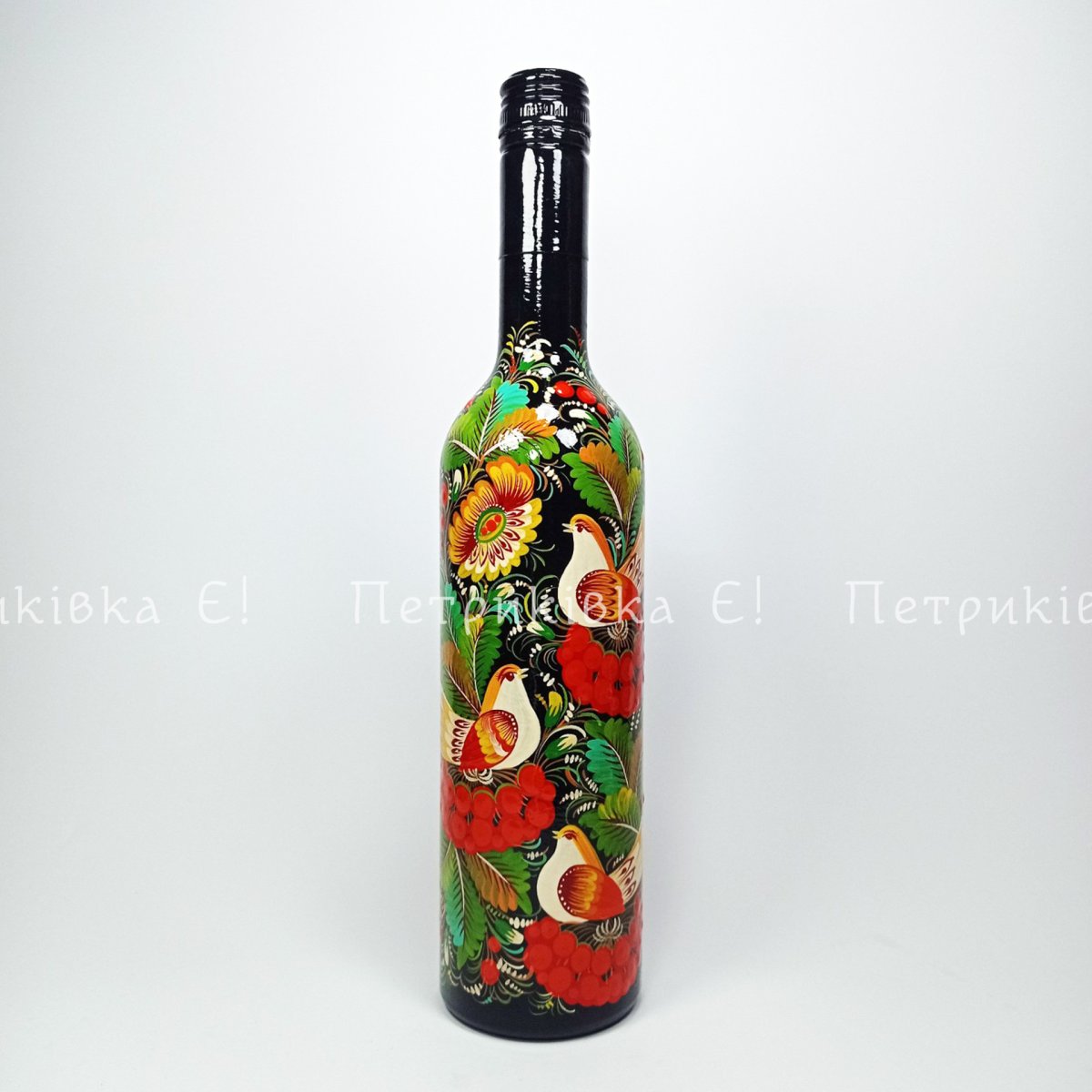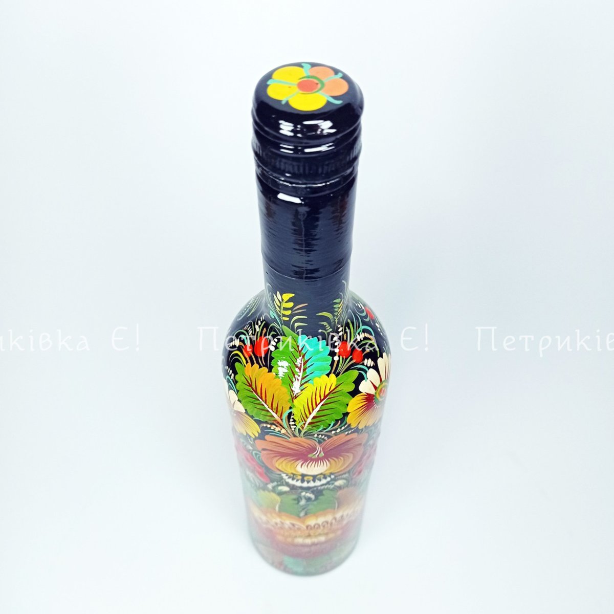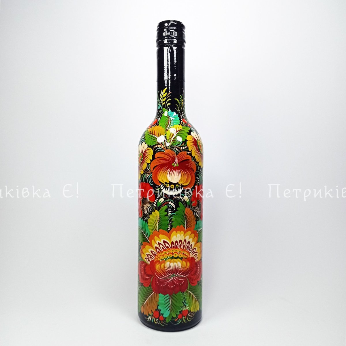 Пляшка розписана Петриківським розписом, об'єм 0,75 л, матеріал - скло. Висота - 32,5 см, діаметр - 7,5 см