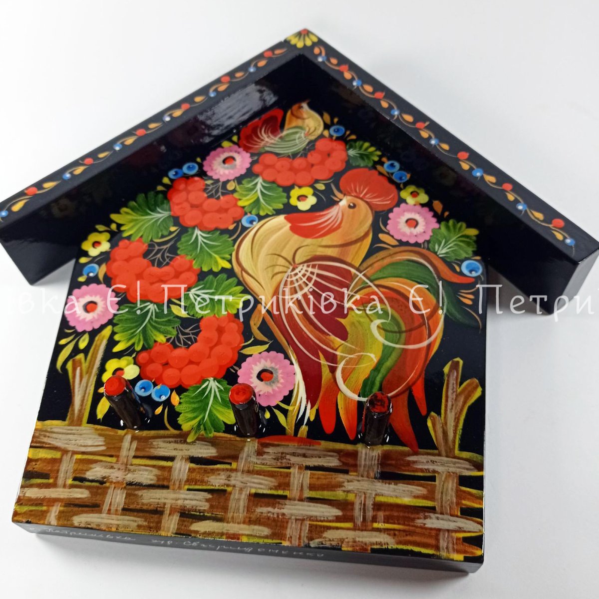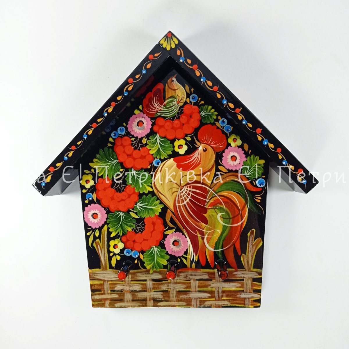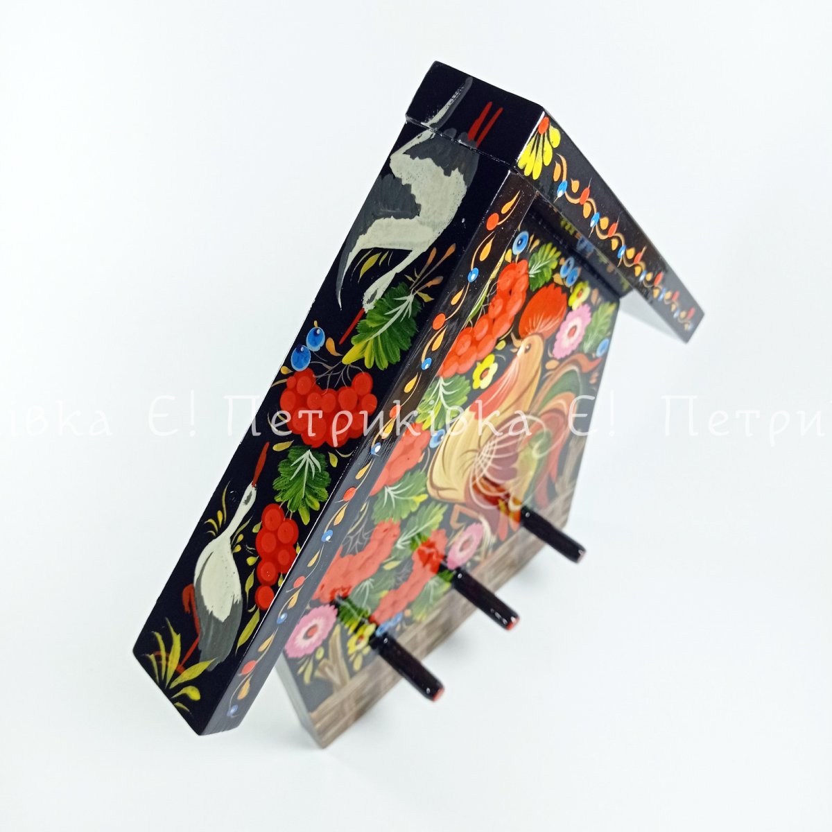 Ключниця з деревини берези. Ширина - 23 см, висота - 23 см. Розписана гуашшю, три шари глянцевого лаку