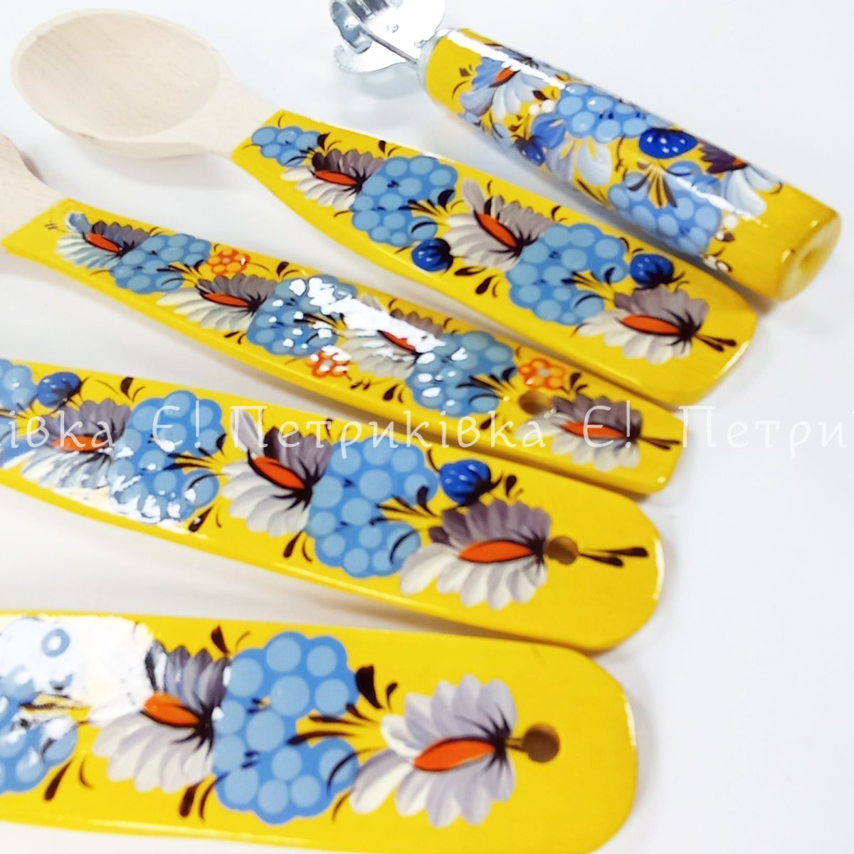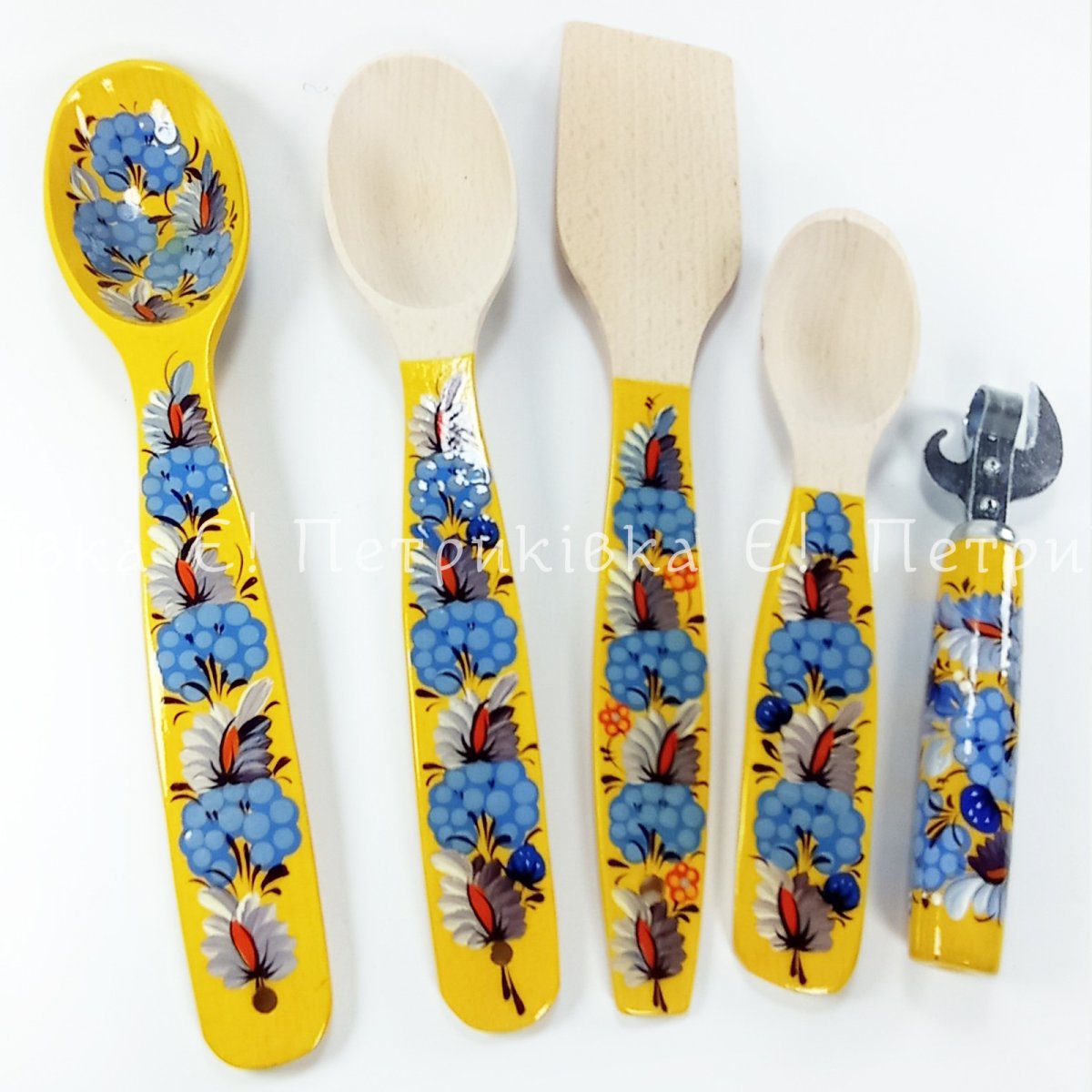 Подарунковий набір з трьох ложок: ложка велика декоративна (довжина - 26 см), ложка велика (довжина - 26 см), столова (довжина 20 см), лопатки та відкривалки. Матеріал - деревина буку. Розписано в одному стилі гуашшю. Призначений для використання за призначенням, окрім декоративної ложки