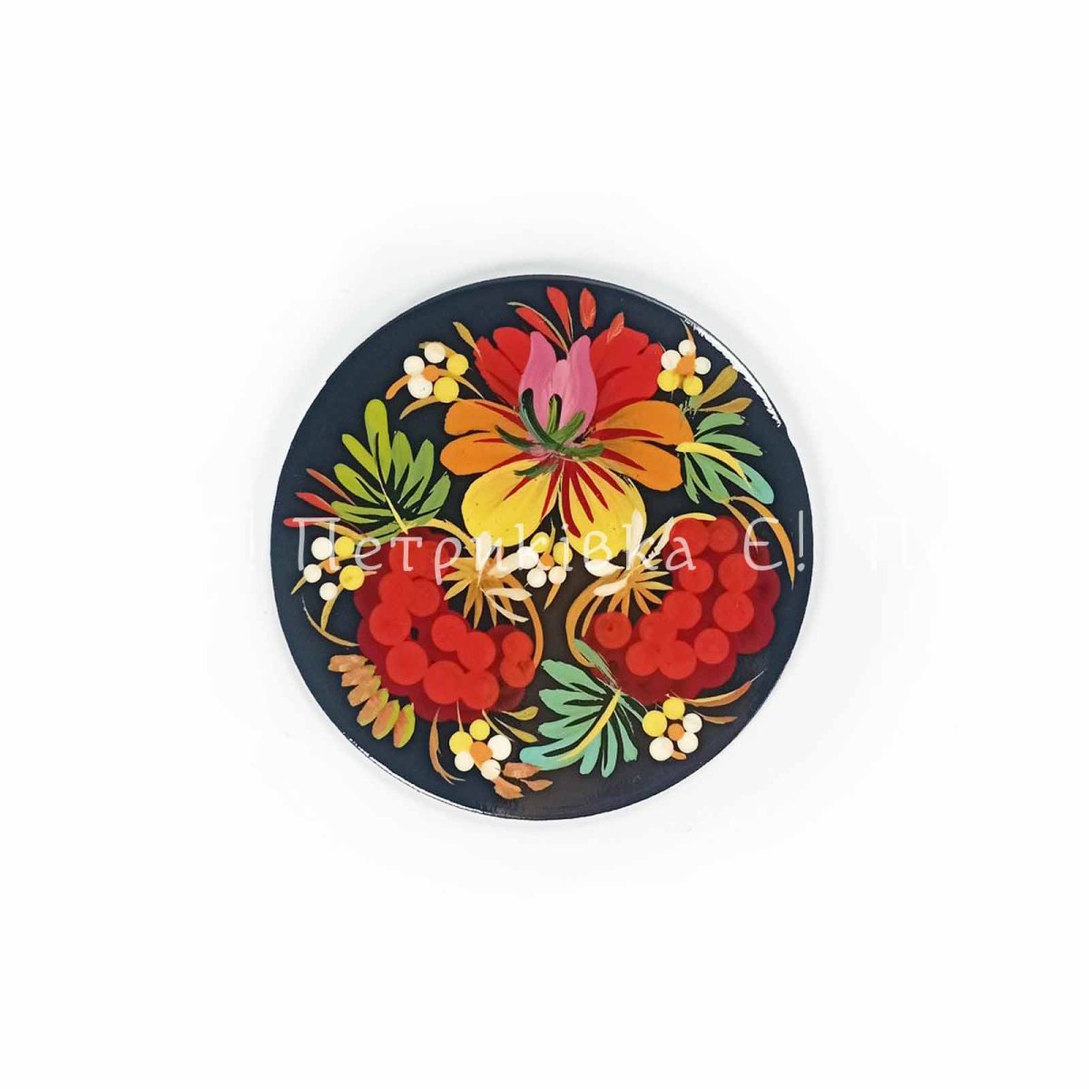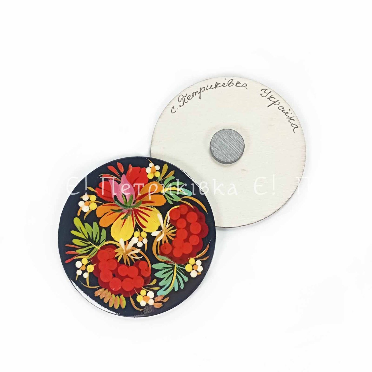 Магніт з Петриківським розписом "Круглий з калинкою та квіткою" (Ø8 см)