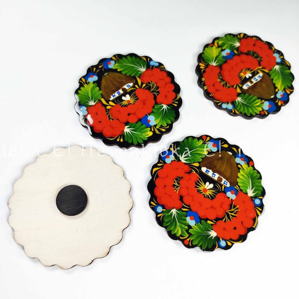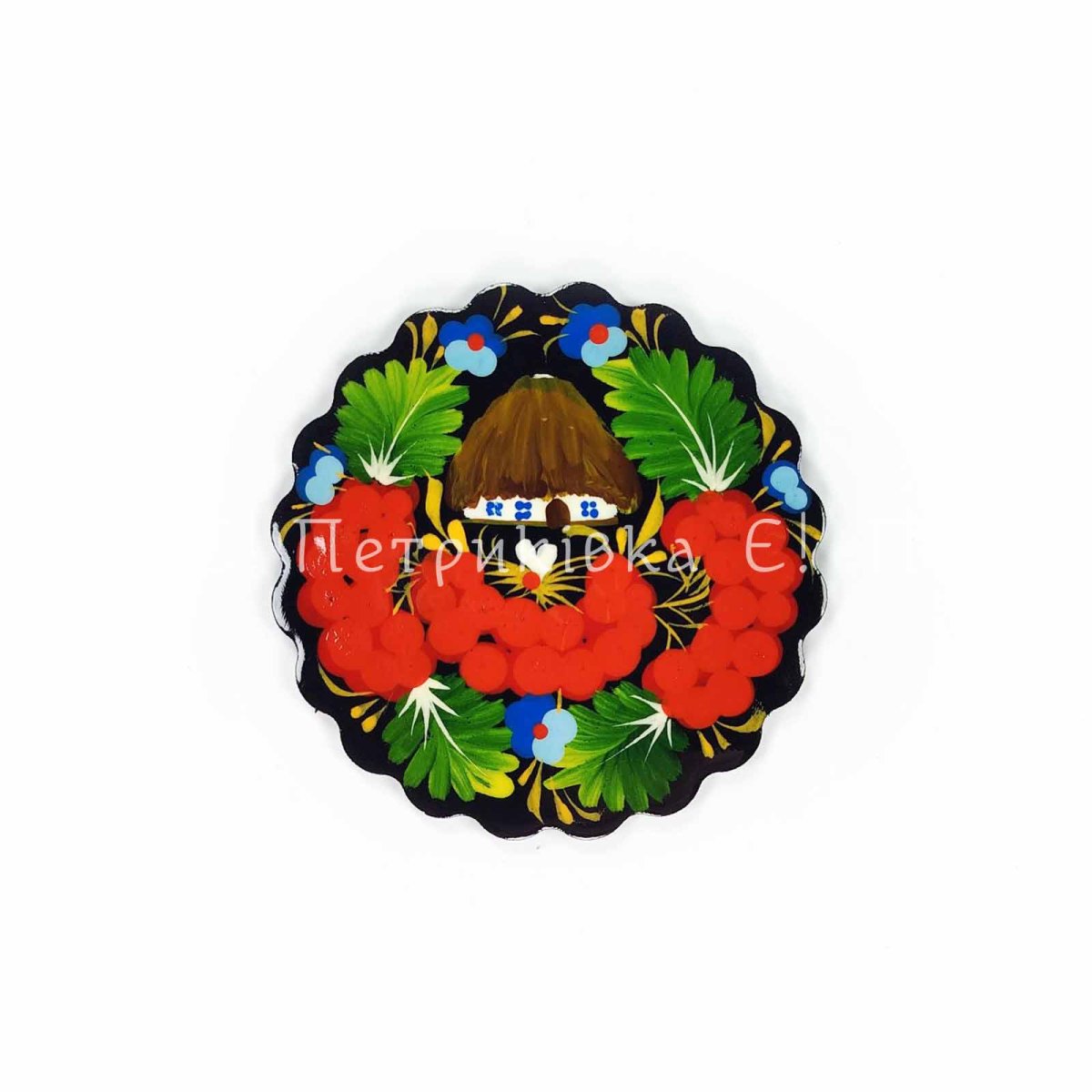 Магніт з Петриківським розписом "Фігурний з хаткою у калині" (Ø8 см)