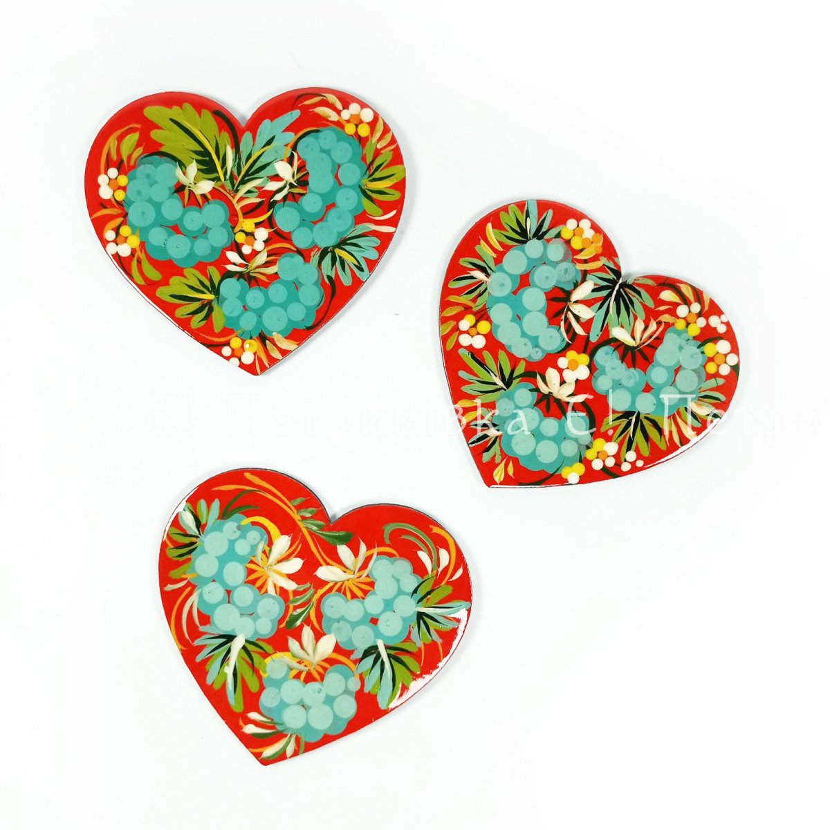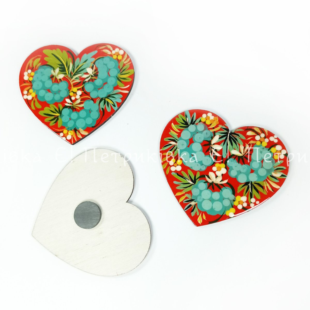 Магніт з Петриківським розписом "Серденько з бірюзовою калинкою" (ширина 8 см)