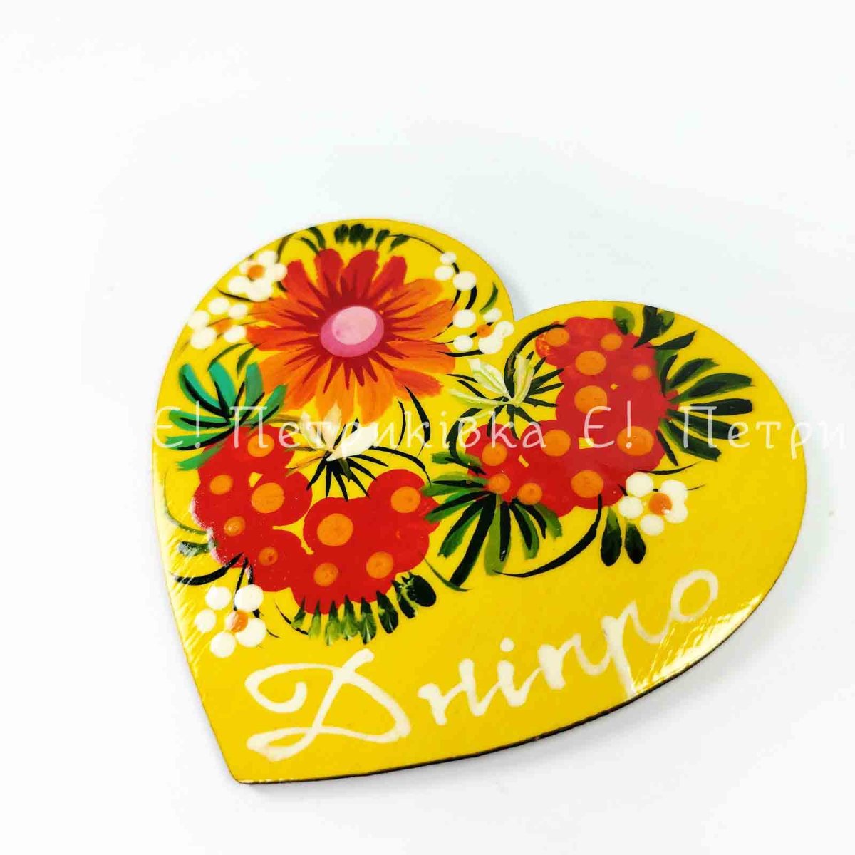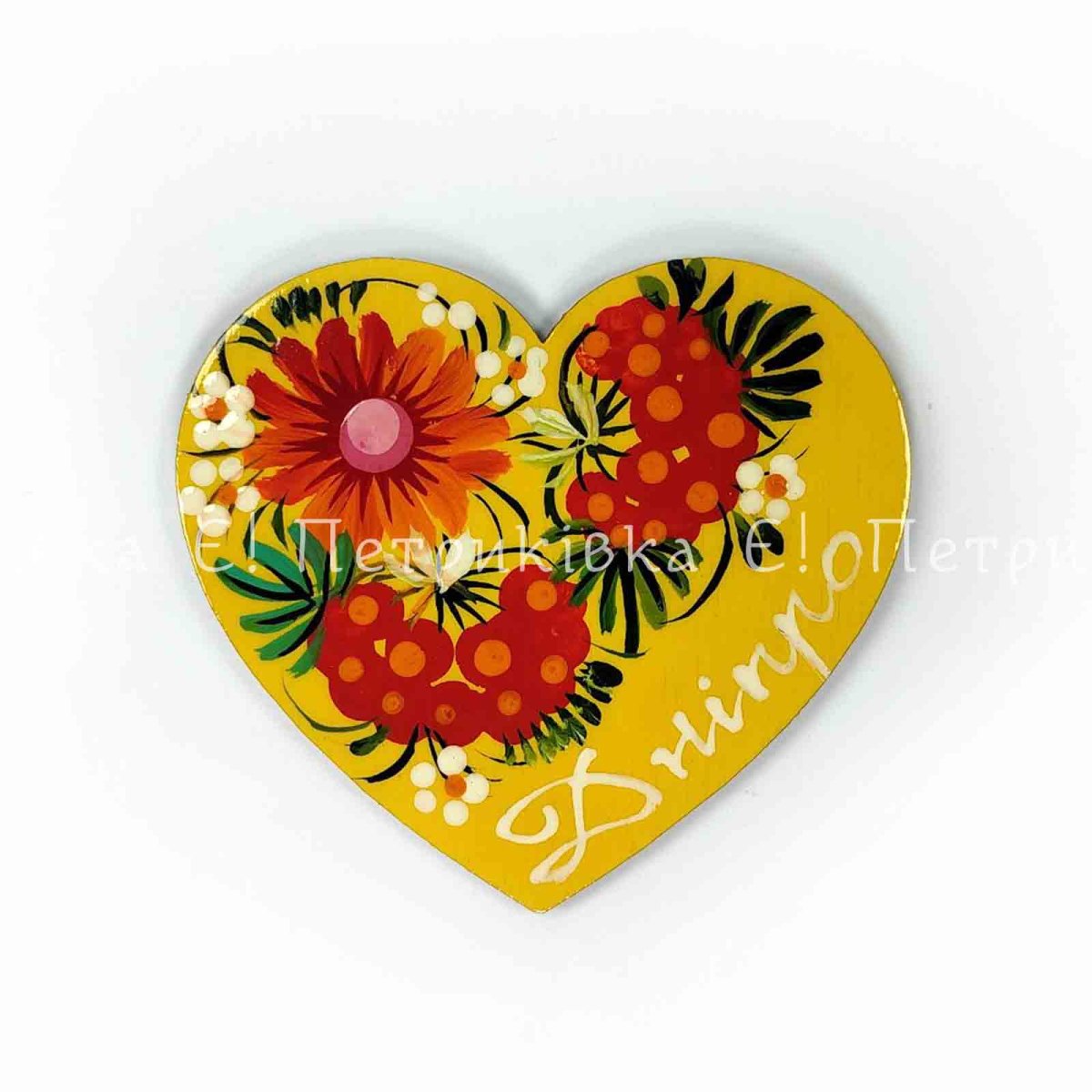 Магніт з Петриківським розписом "Серденько Дніпро" на жовтому (ширина 8 см)