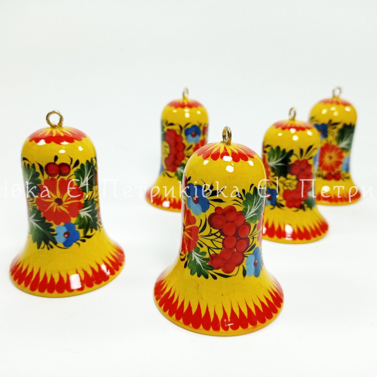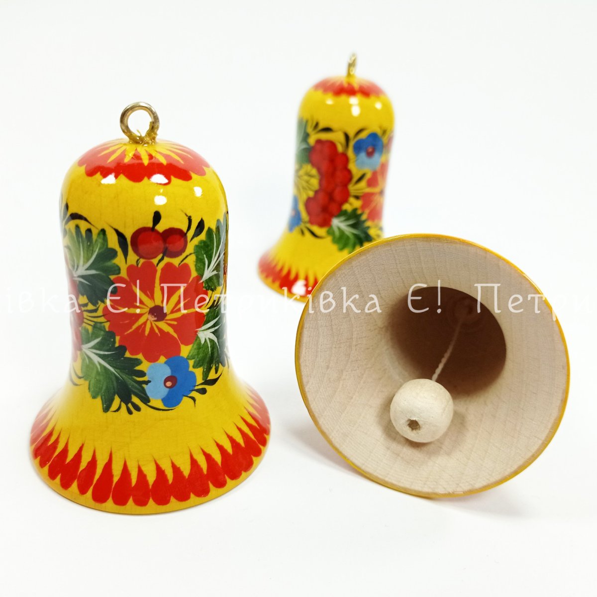 Дзвоник з дерева з Петриківським розписом. Висота - 7 см, діаметр - 5 см. Розписано гуашшю, вкрито глянцевим лаком, без запаху