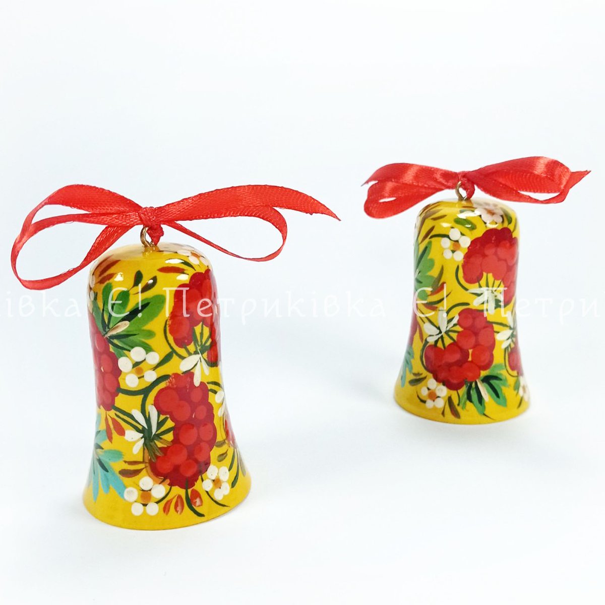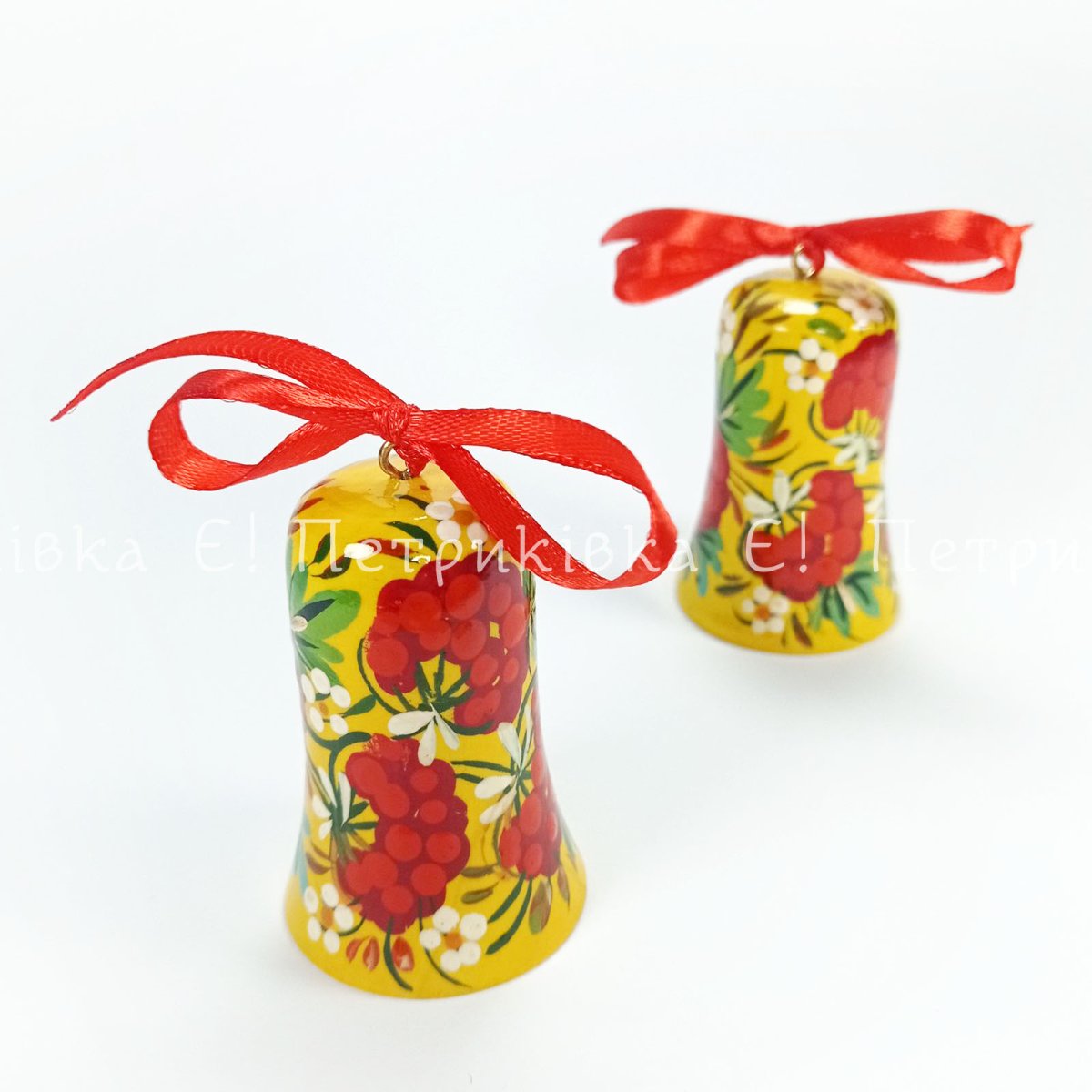 Дзвоник дерев'яний (висота 6,5 см) з Петриківським розписом по жовтому