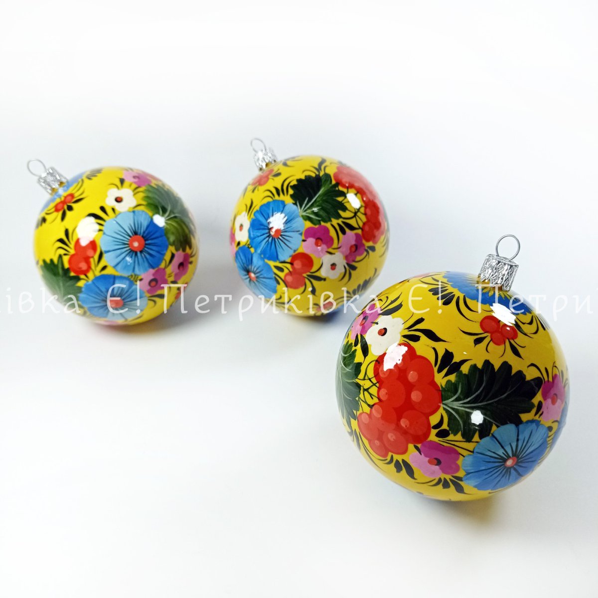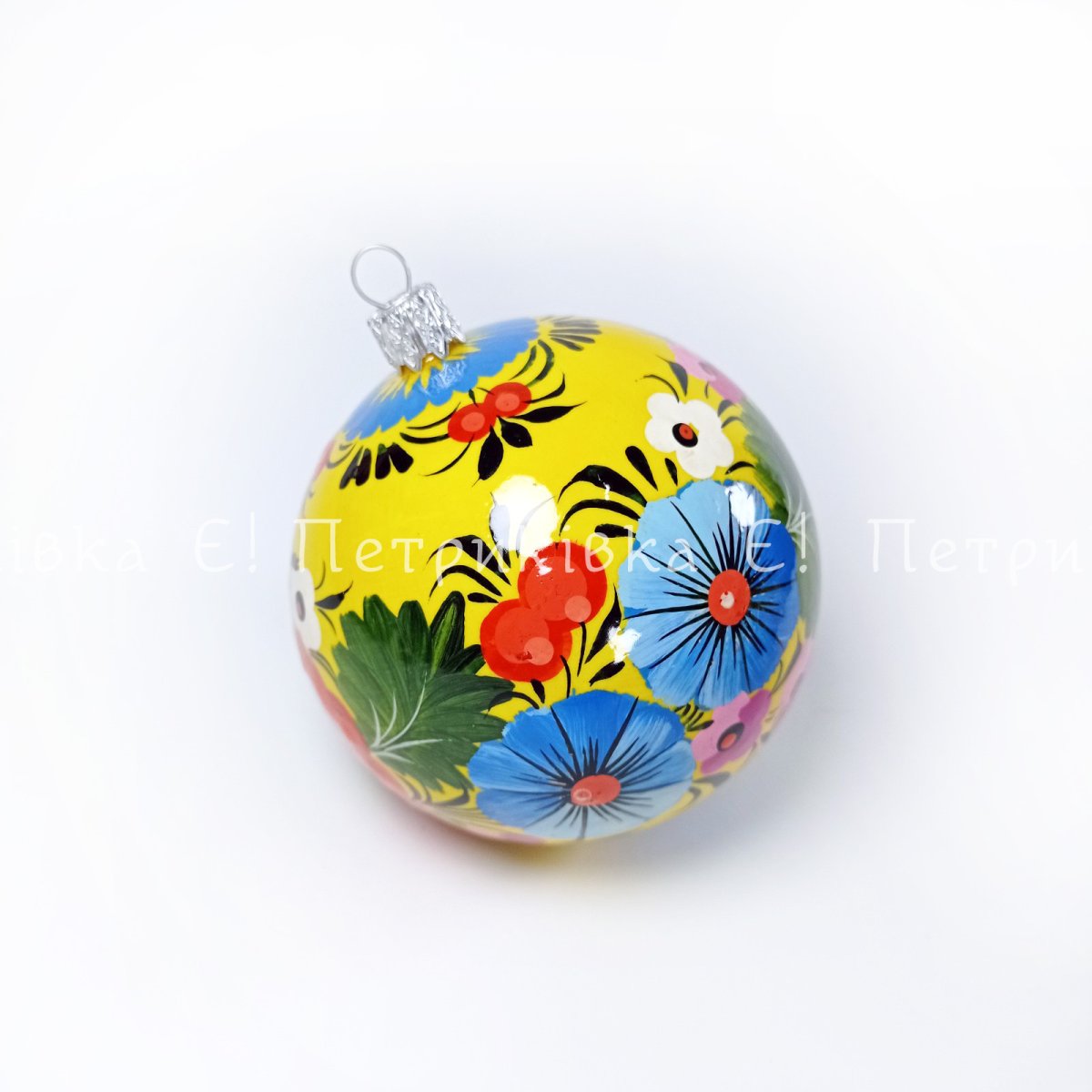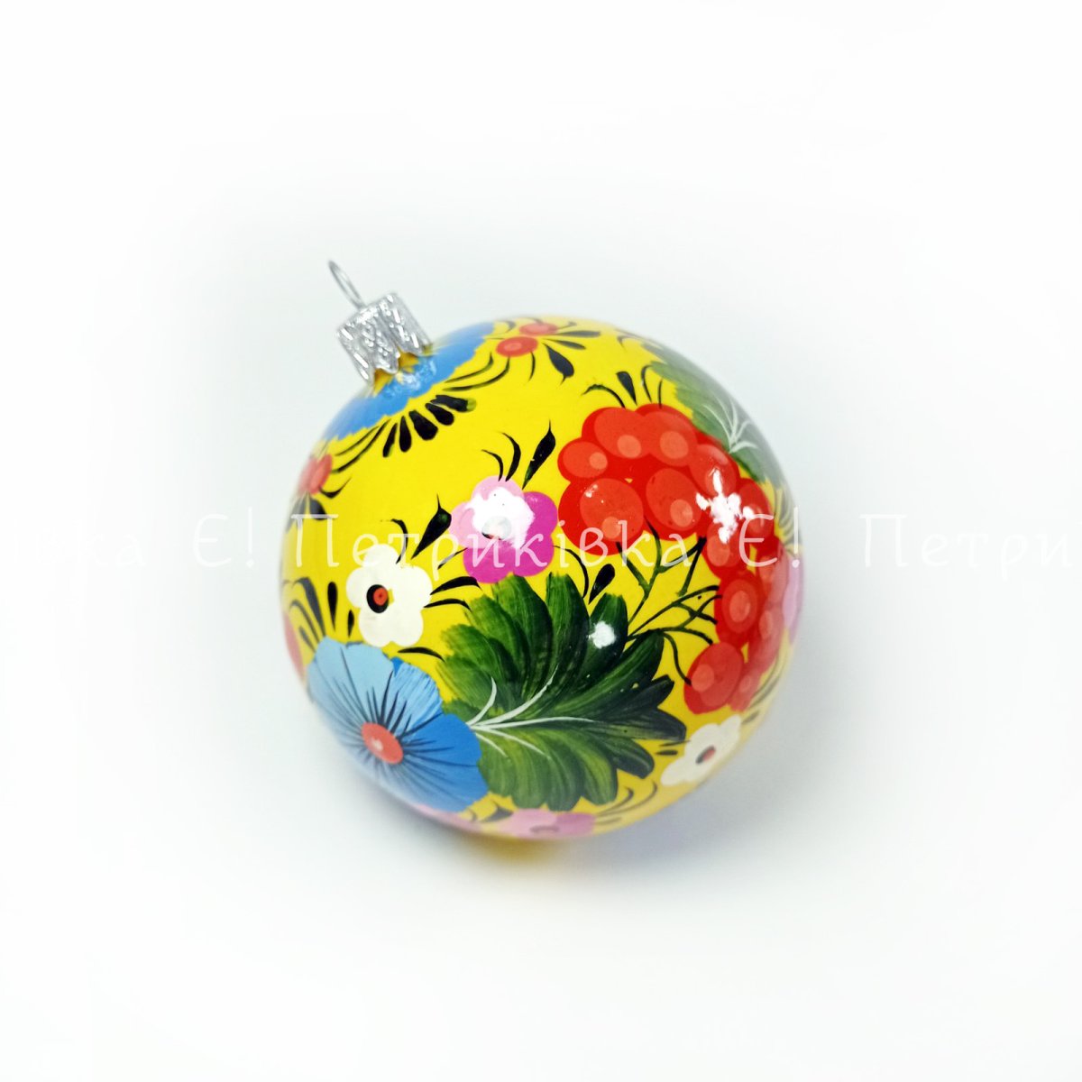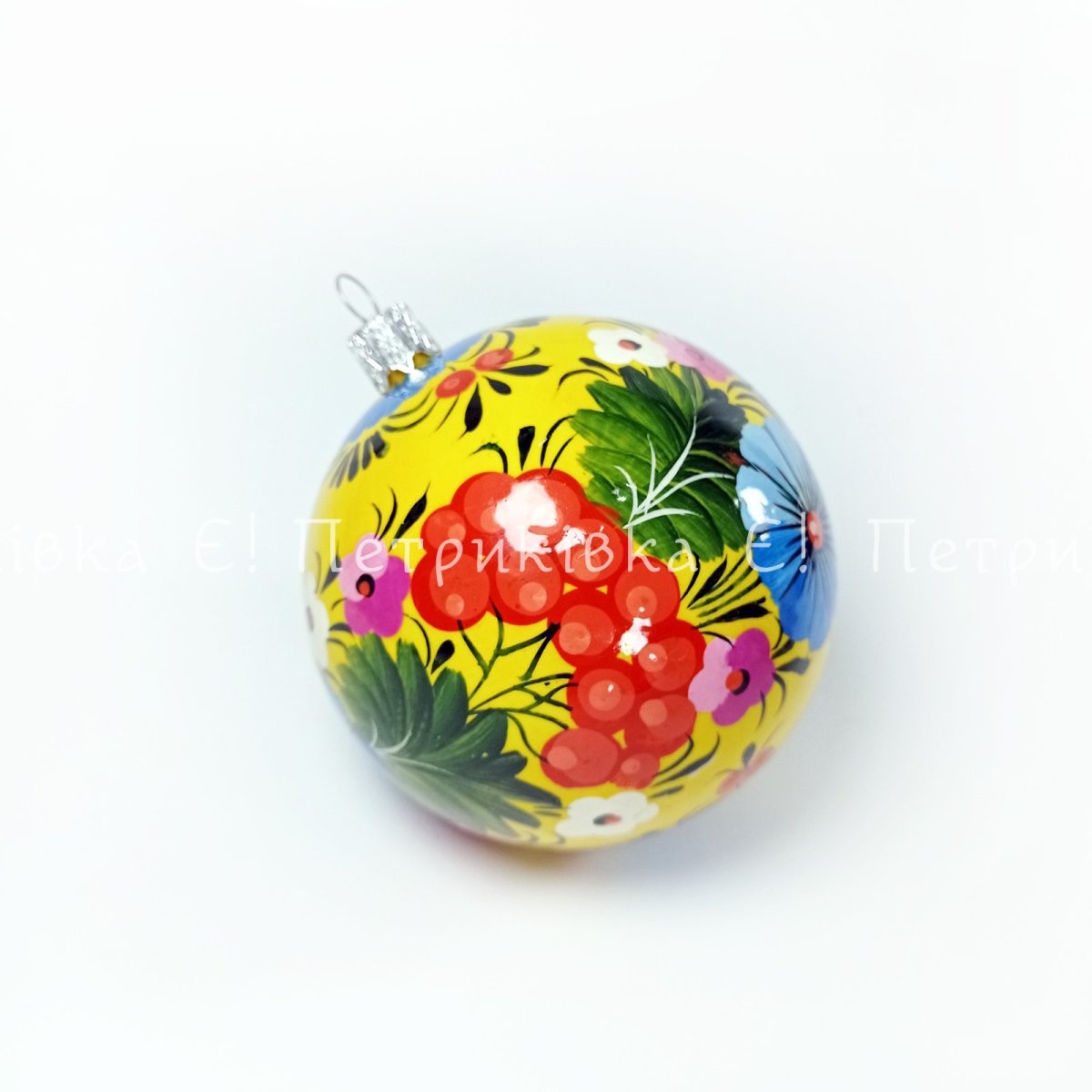 Ялинкова куля діамером 8 см з пластику, не розбивається при падінні. Розписано вручну гуашшю, оригінальний Петриківський розпис. Фон - жовтий. Два шари глянцевого лаку, без запаху.