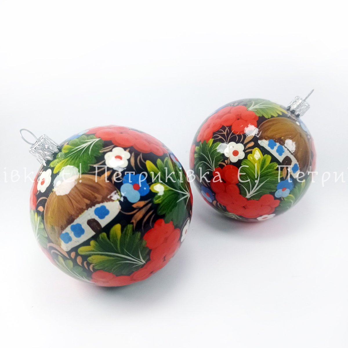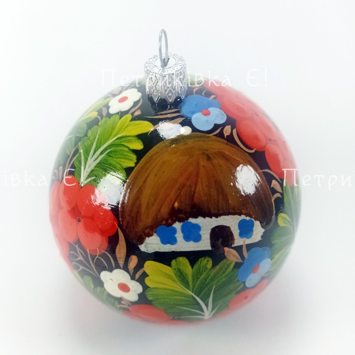 Ялинкова куля з Петриківським розписом "№3 з хатинкою"
