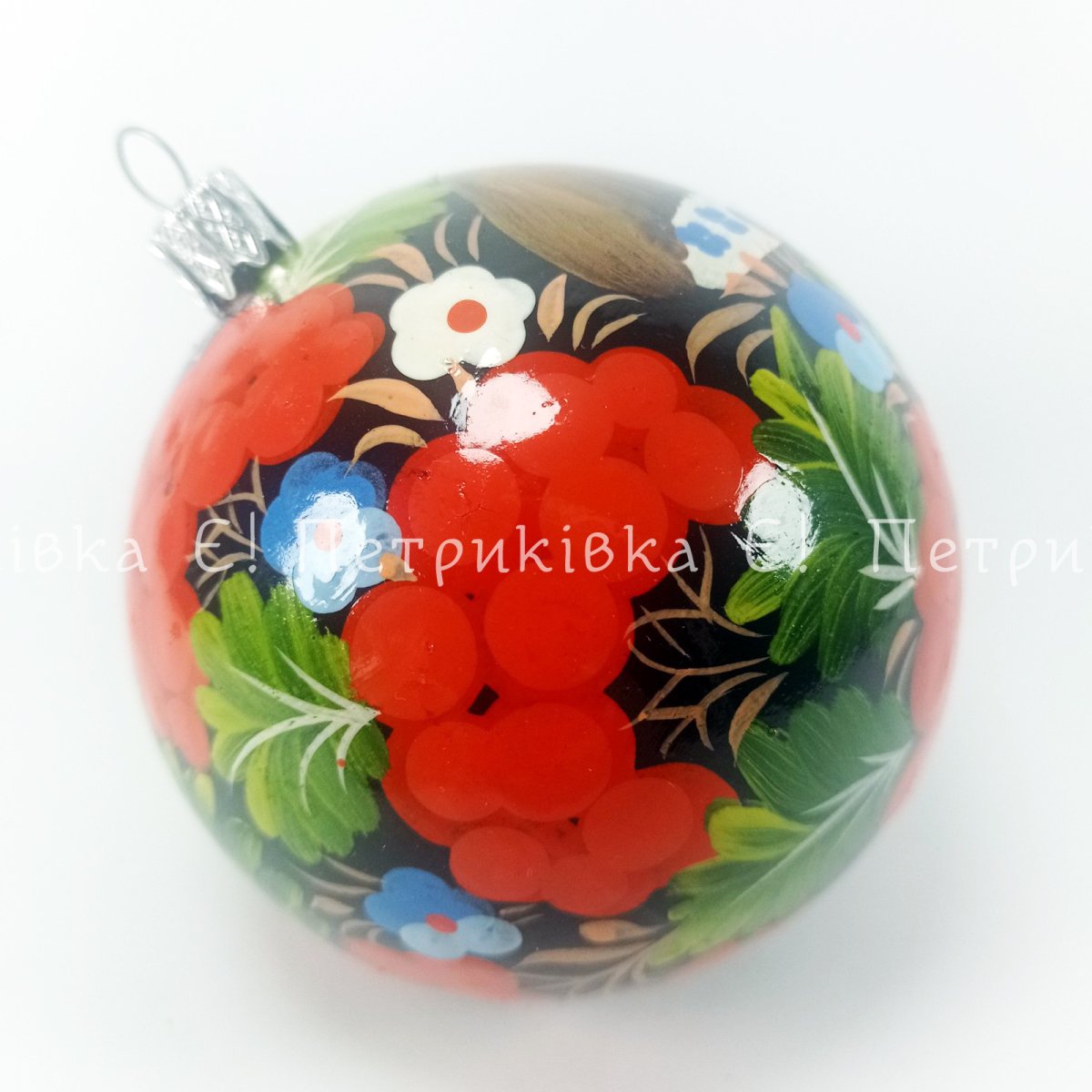 Ялинкова куля діамером 8 см з пластику, не розбивається при падінні. Розписано вручну гуашшю, оригінальний Петриківський розпис. Фон - чорний. Два шари глянцевого лаку, без запаху.