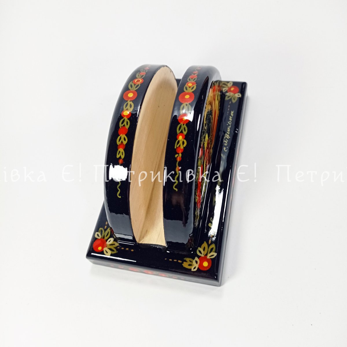 Серветниця зроблена з деревени бука. Довжина - 14 см, ширина - 7,5 см, висота - 7 см. Ширина пазу для серветок - 1,5 см. Розпис виконано гуашшю. Три шари глянсового лаку