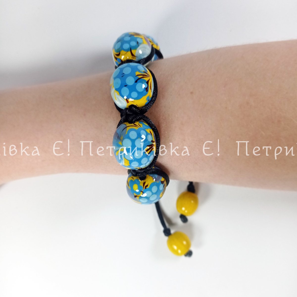 Шикарный браслет из деревянных бусин выточенных вручную и расписанных оригинальной авторской Петриковской росписью. Наши браслеты с плетением не имеют аналогов на рынке сувениров и подарков в Украине и во всём Мире. Сочетание богатой, яркой росписи и строгое черное плетение, делают наши браслеты уникальными украшениями под любой наряд.