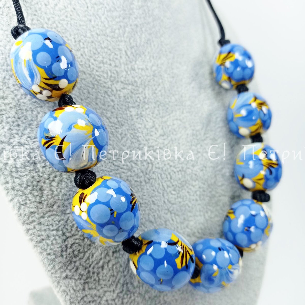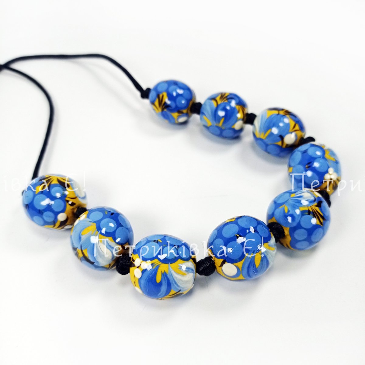 Бусы Петриковская роспись "Голубая калина на жёлтом" 9 бусин