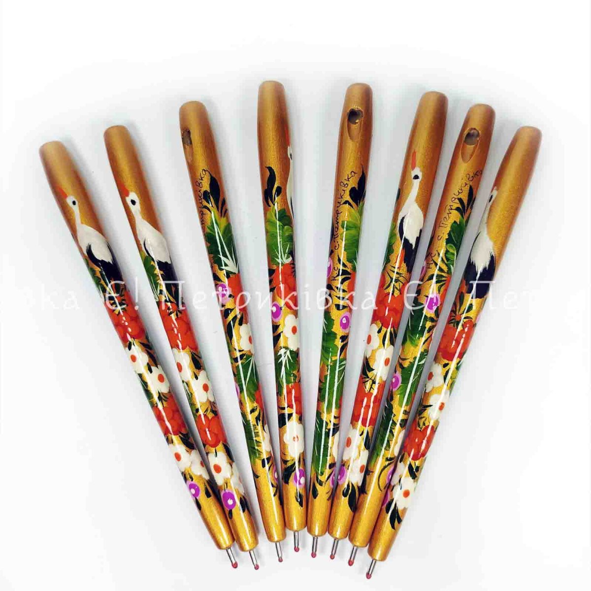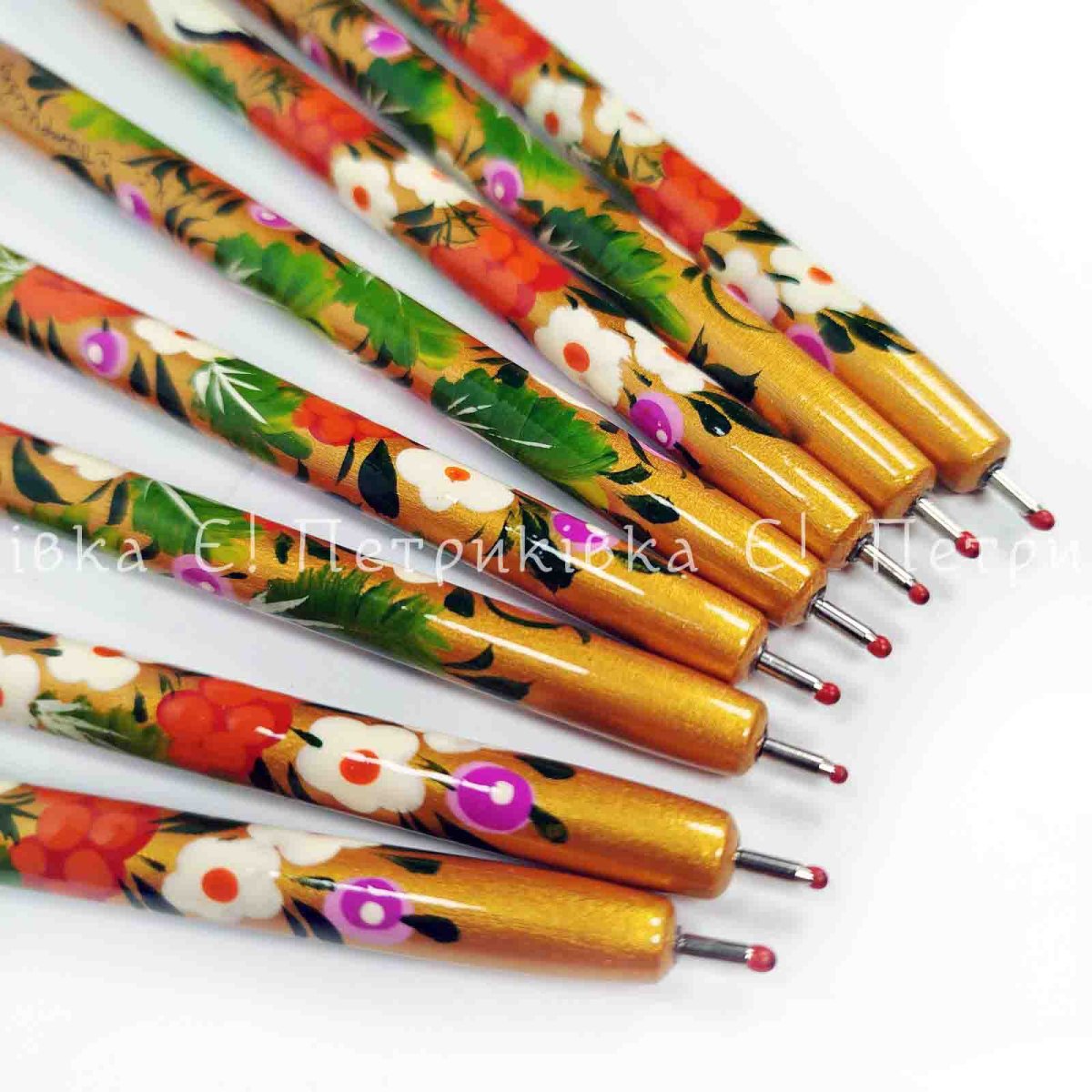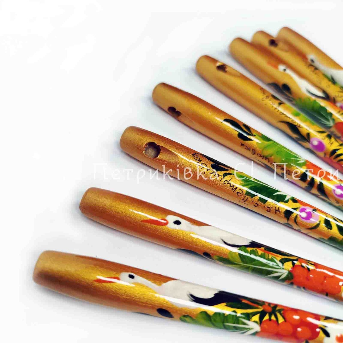 Ручка деревянная, расписанная Петриковским орнаментом. Длина - 16 см. Роспись гуашью, два слоя лака. Цвет пасты - синий