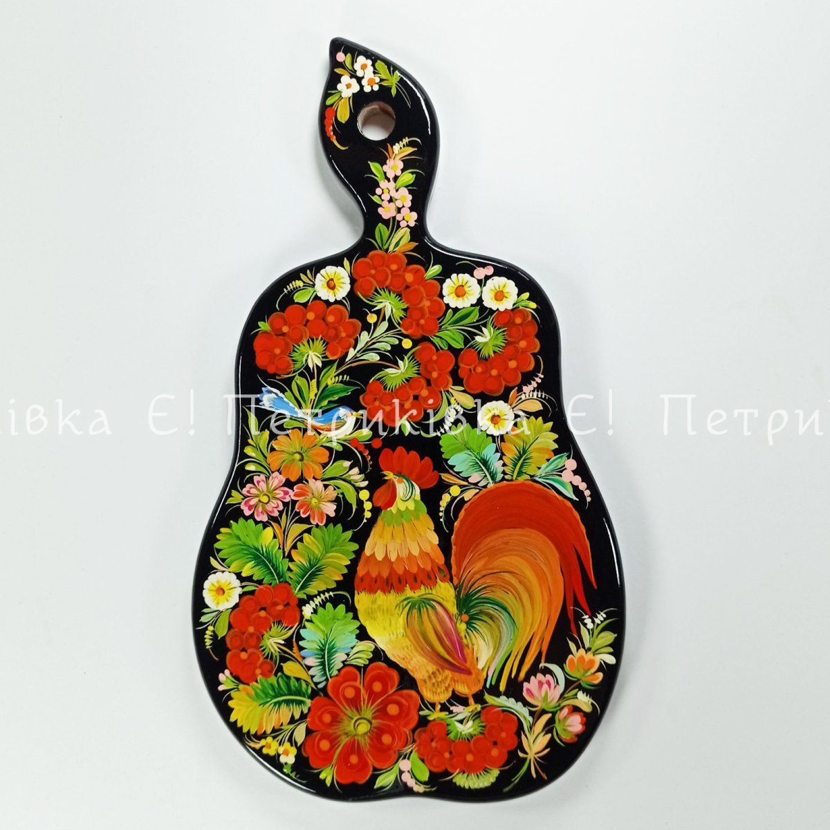 Доска грушка большая с Петриковской росписью "Петух и кукушка"