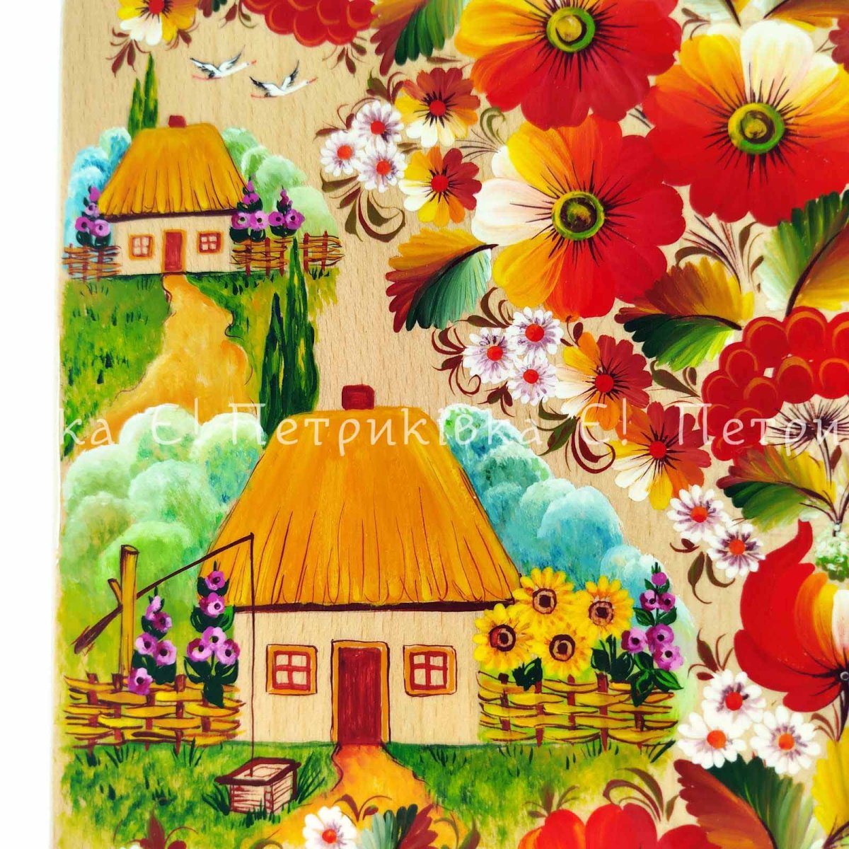 Доска большая (32*17,5 см) с Петриковской росписью "Сельский пейзаж" по дереву