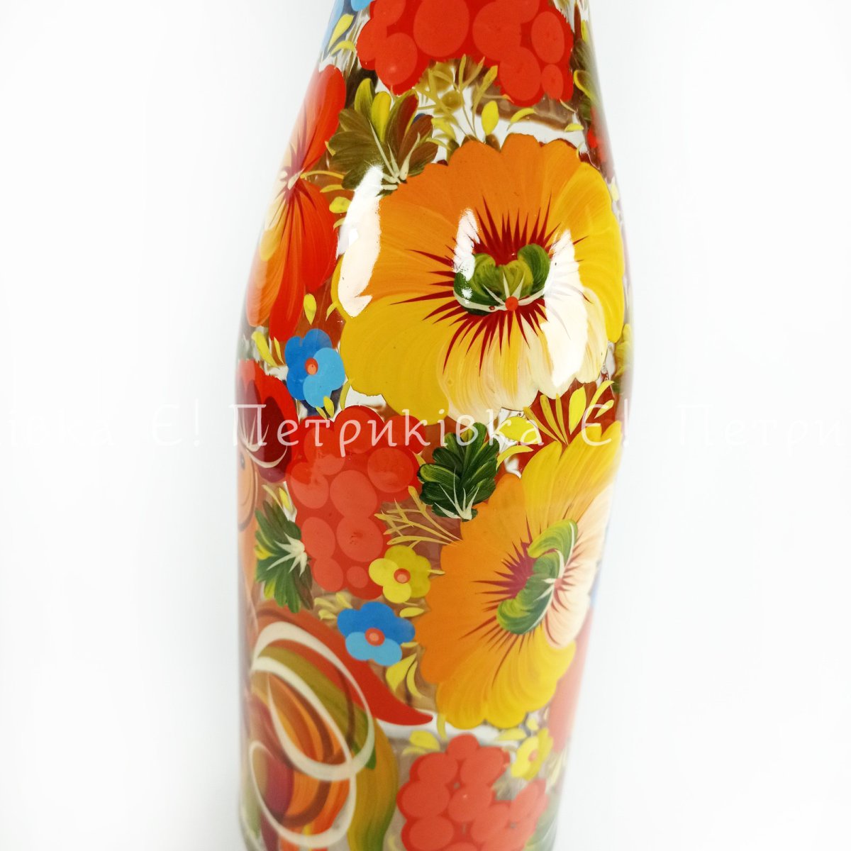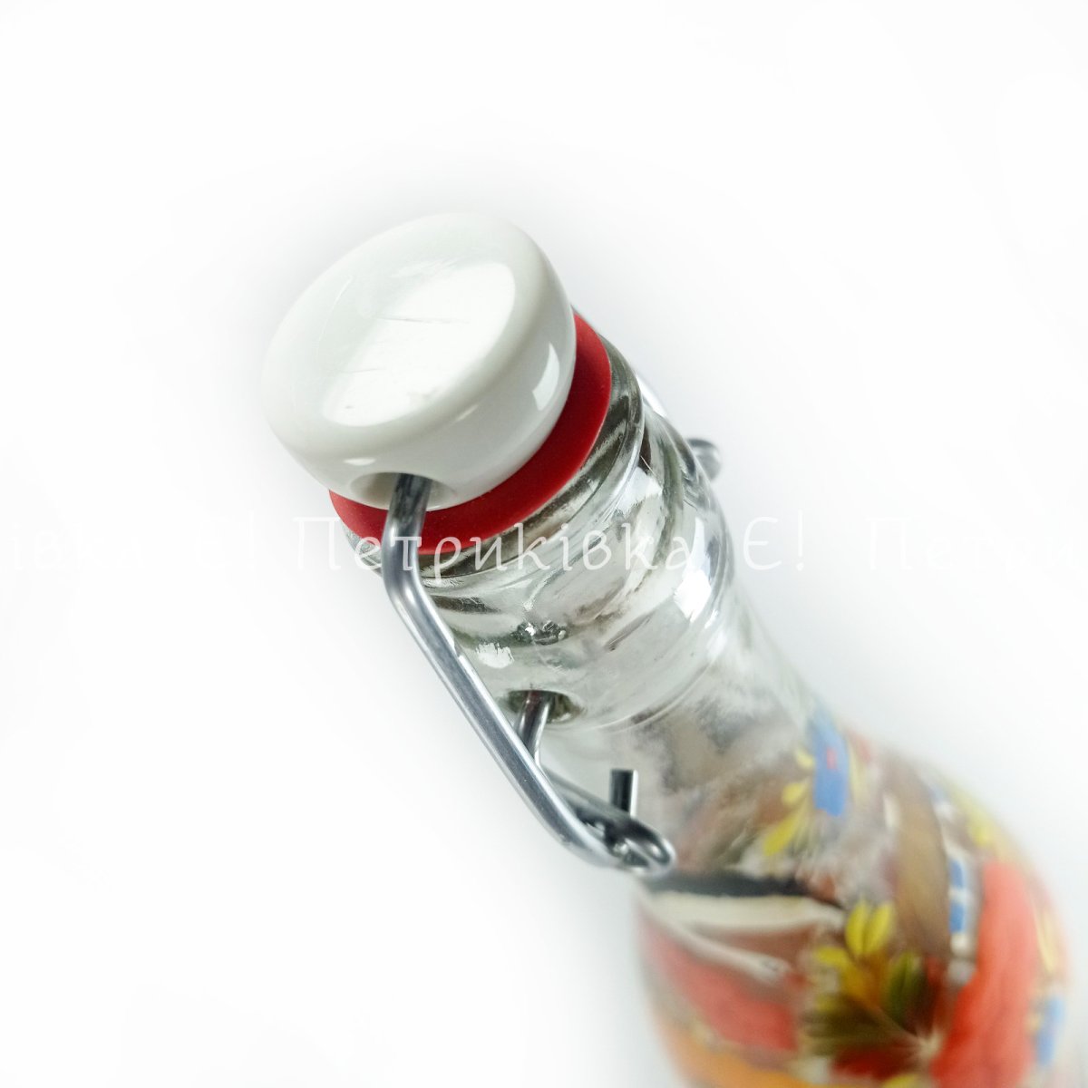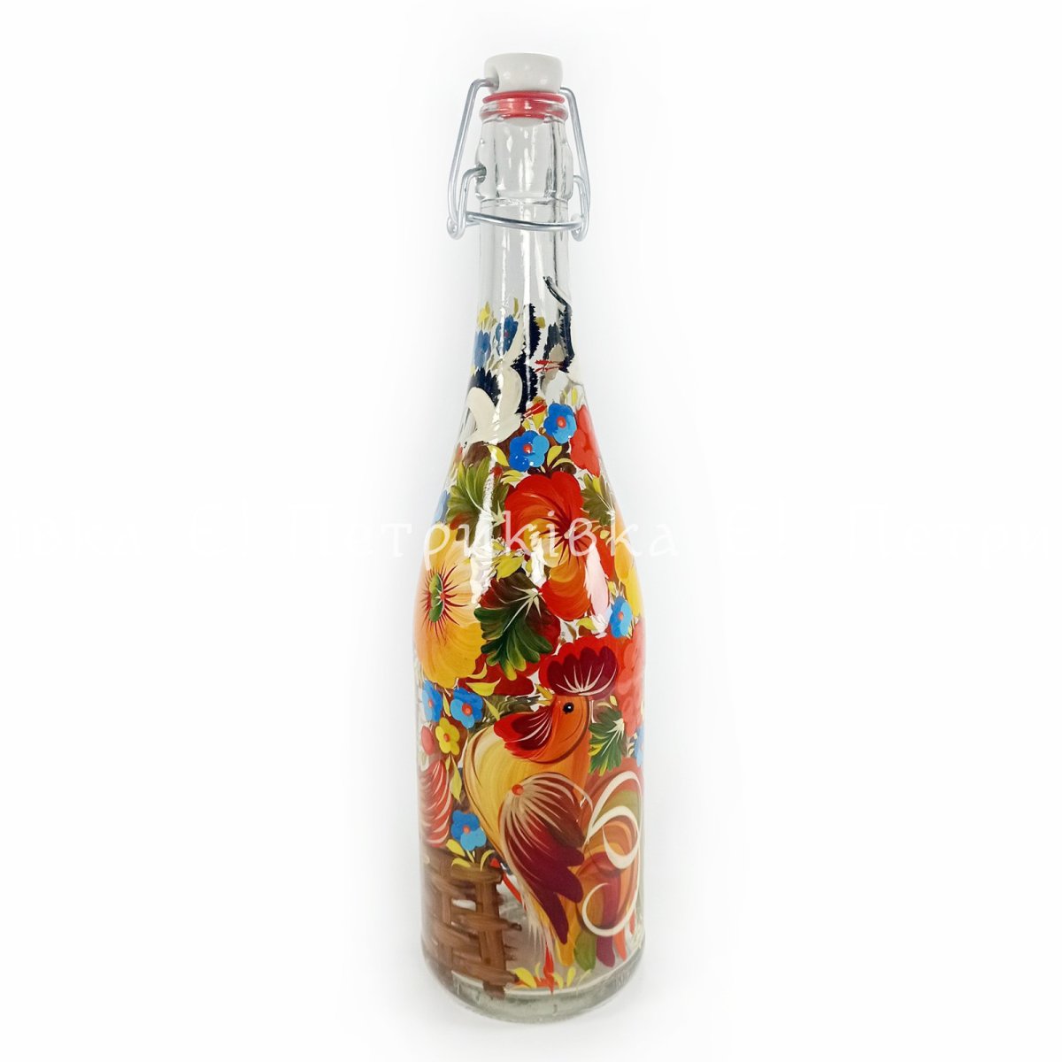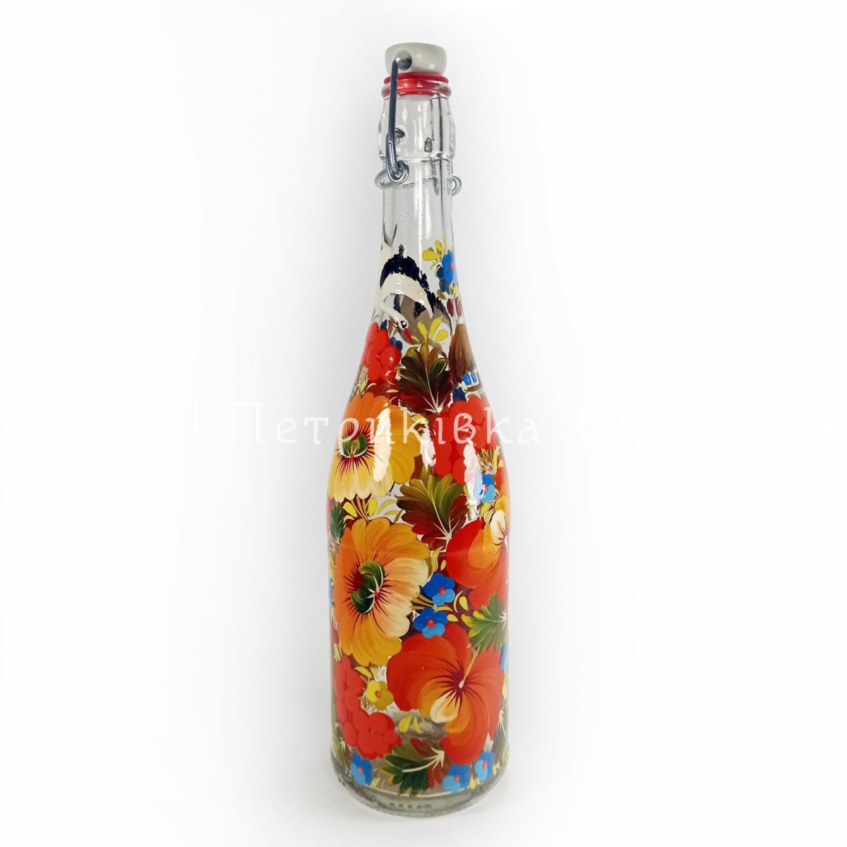 Бутылка с бугельной пробкой расписанная Петриковской росписью, объём 0,75 л, материал - стекло.