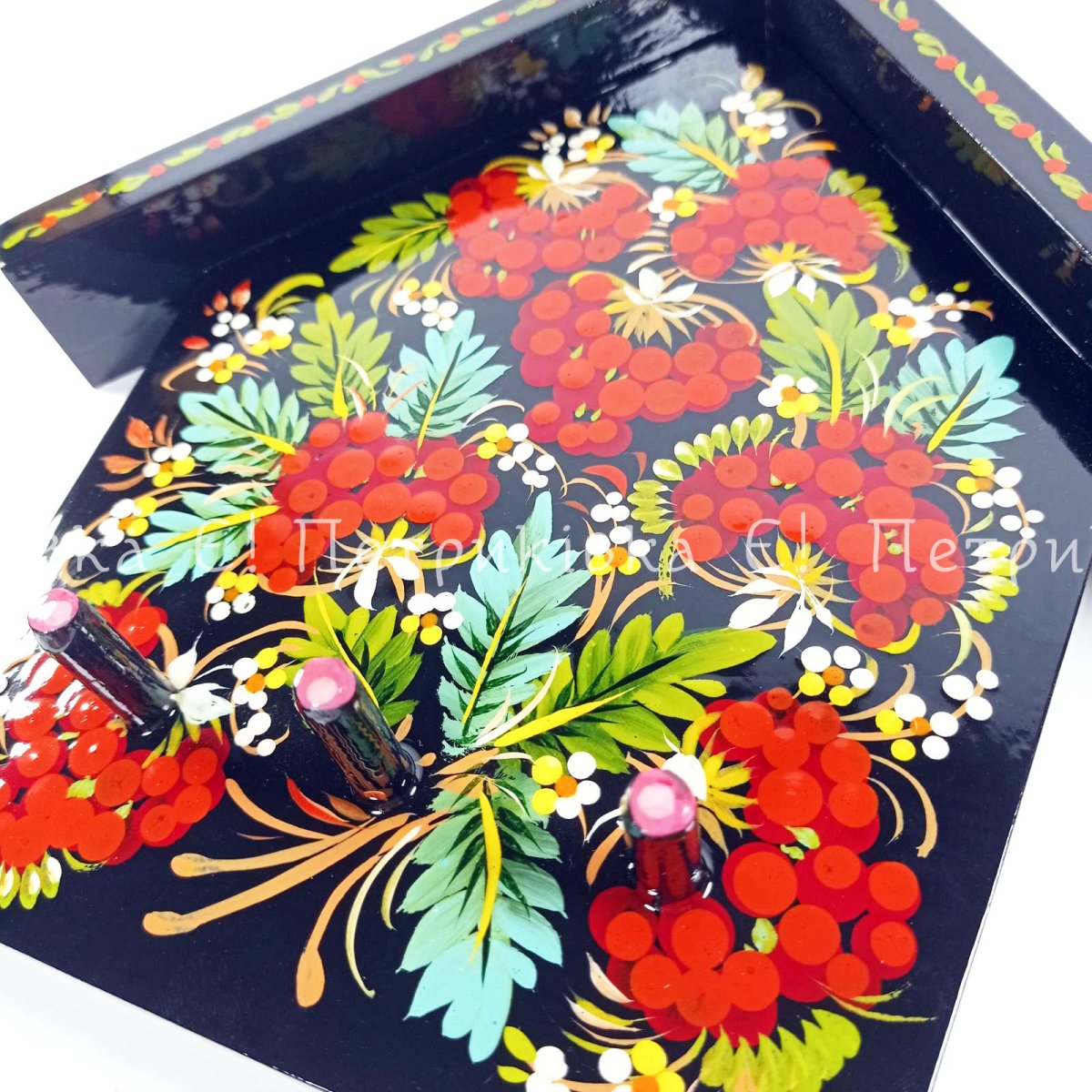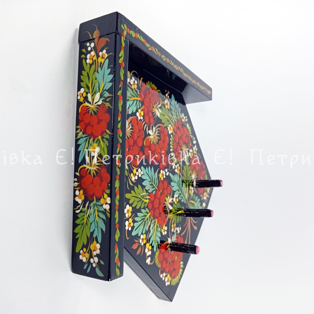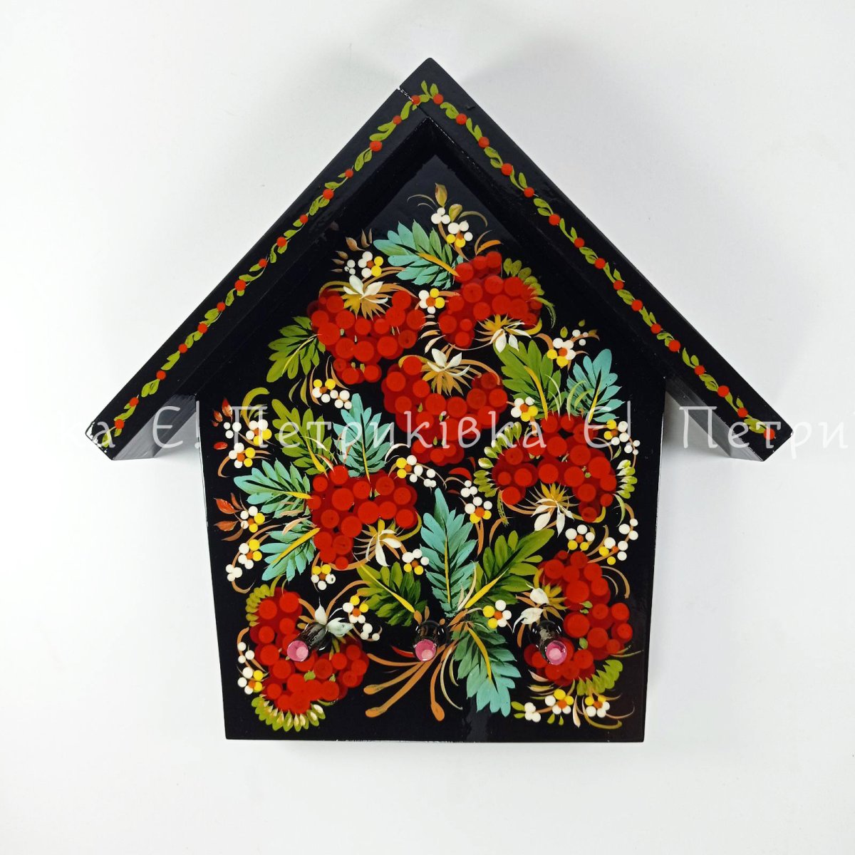 Ключница выполнена из древесины берёзы. Ширина - 23 см, высота - 23 см. Роспись - гуашь, три слоя глянцевого лака.