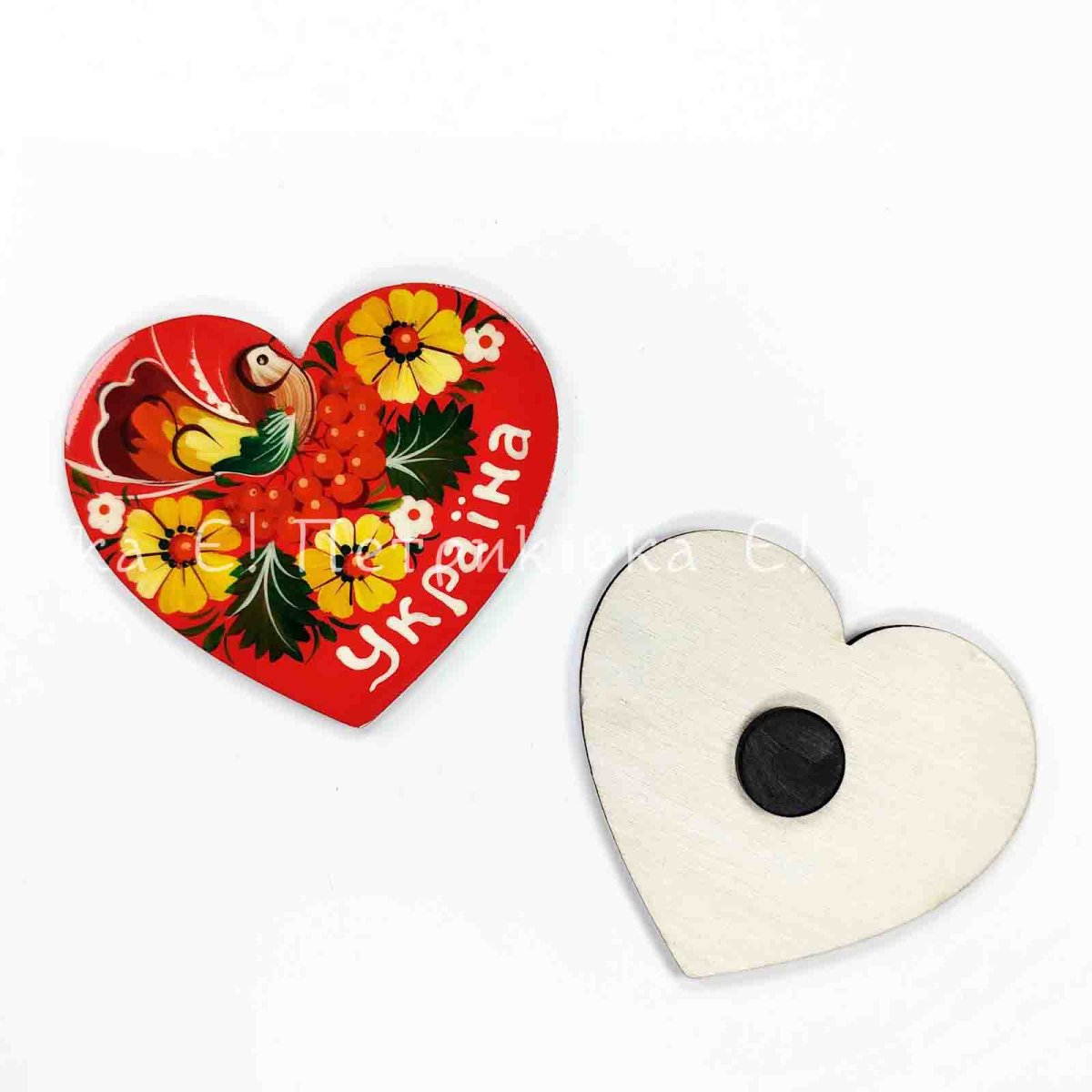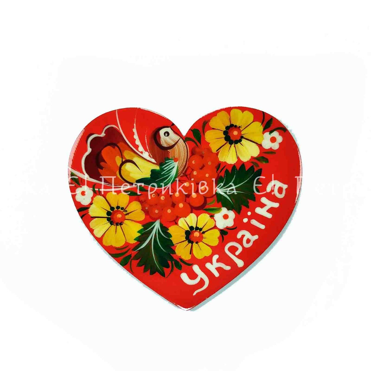 Магнит с Петриковской росписью "Сердечко Україна. С птичкой" (ширина 9 см)