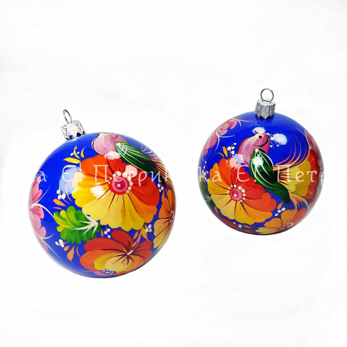 Шар ёлочный 8 см с Петриковской росписью "Сказочная птица на синем"