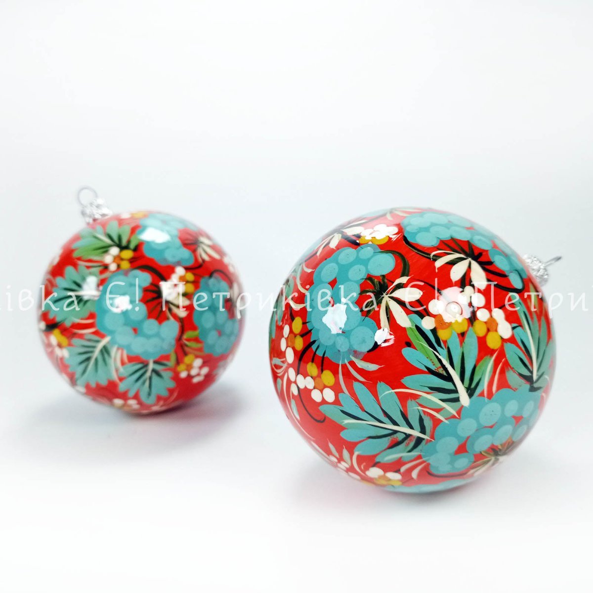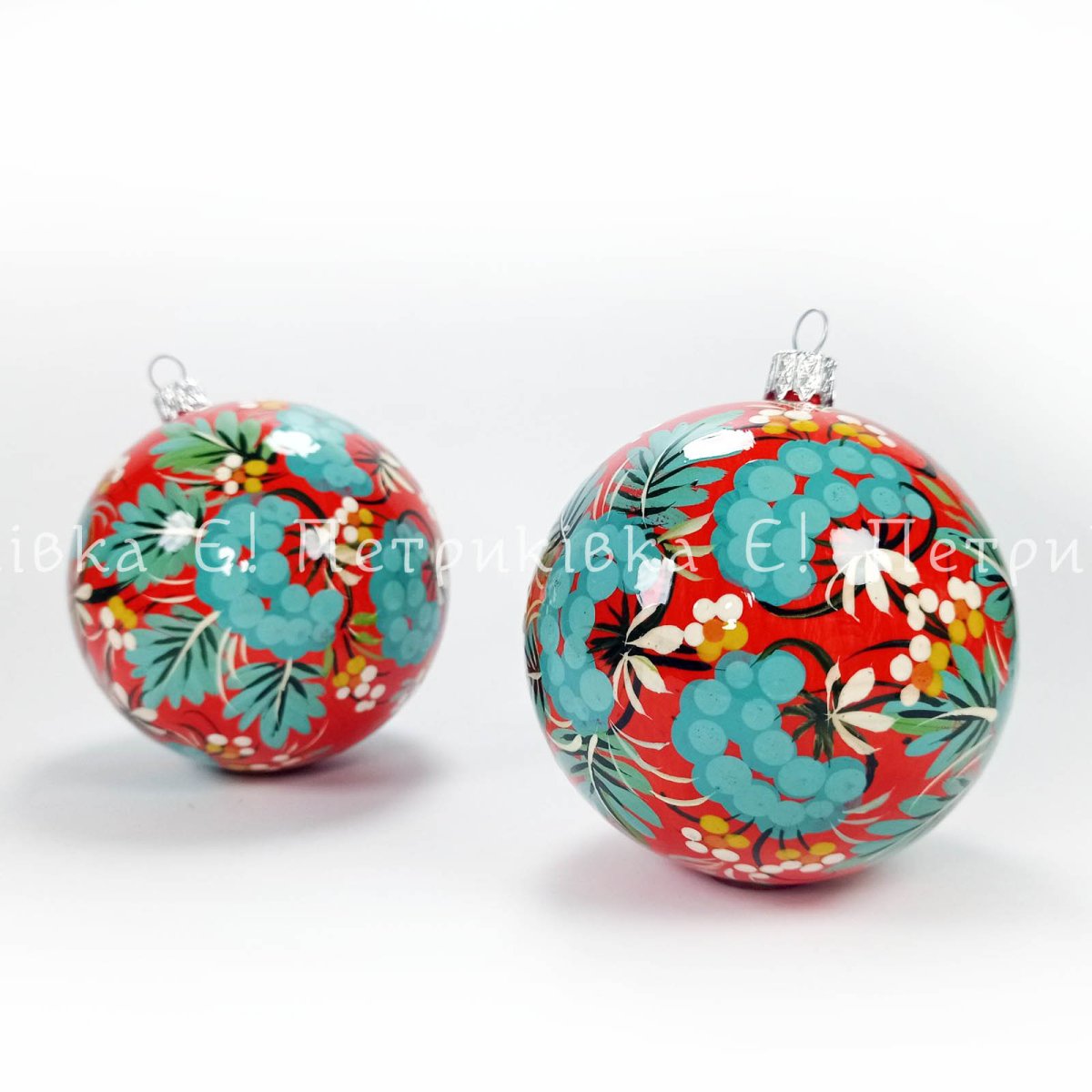Шар ёлочный с Петриковской росписью "Бирюзовая калина на красном"