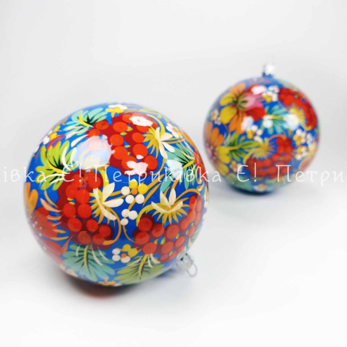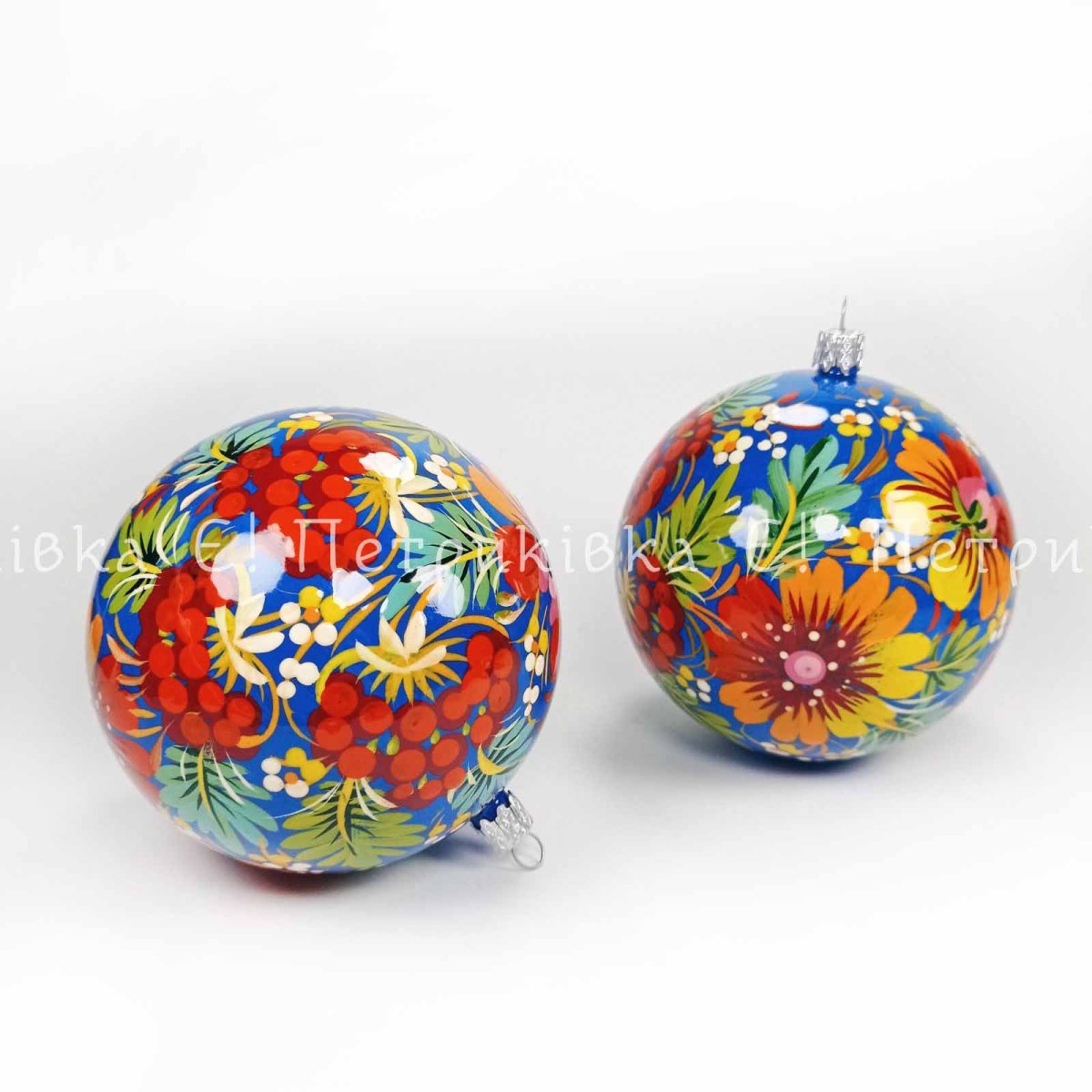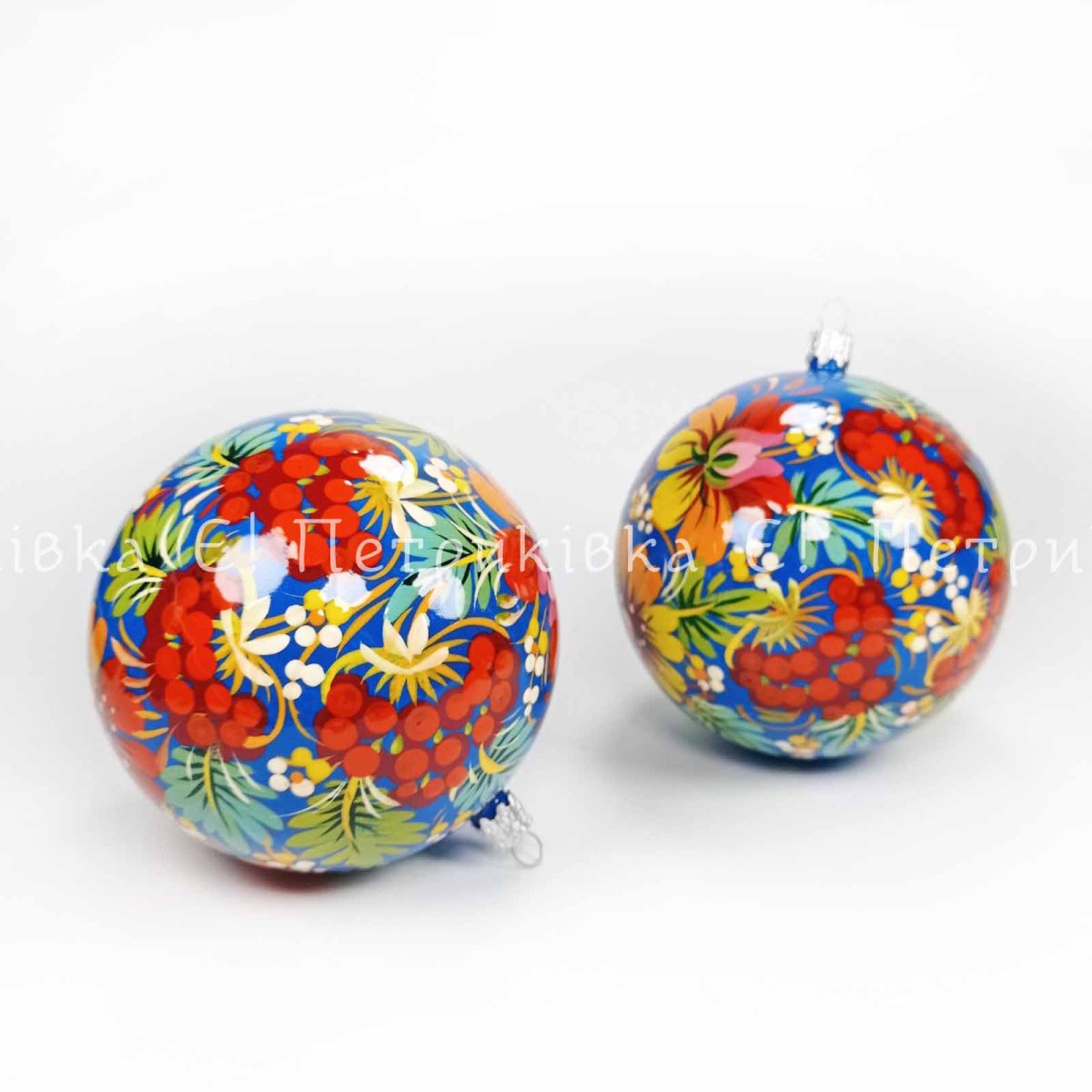 Шар ёлочный 10 см с Петриковской росписью "Цибульки с калиной" по синему