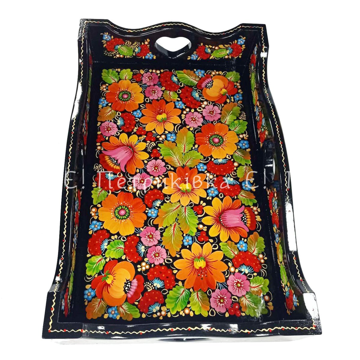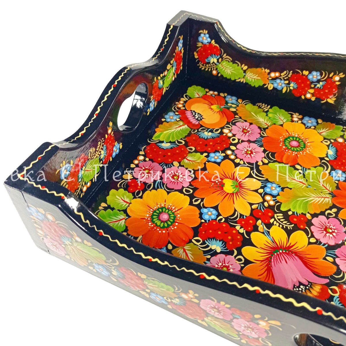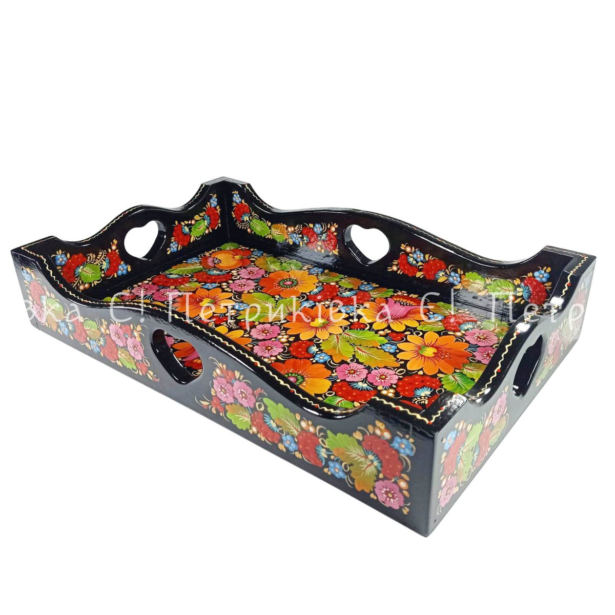 Поднос деревянный (с сердечками) "Петриковский букет"