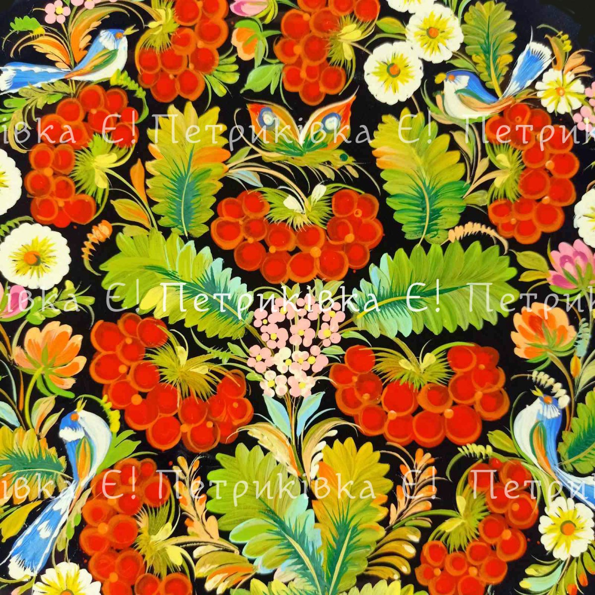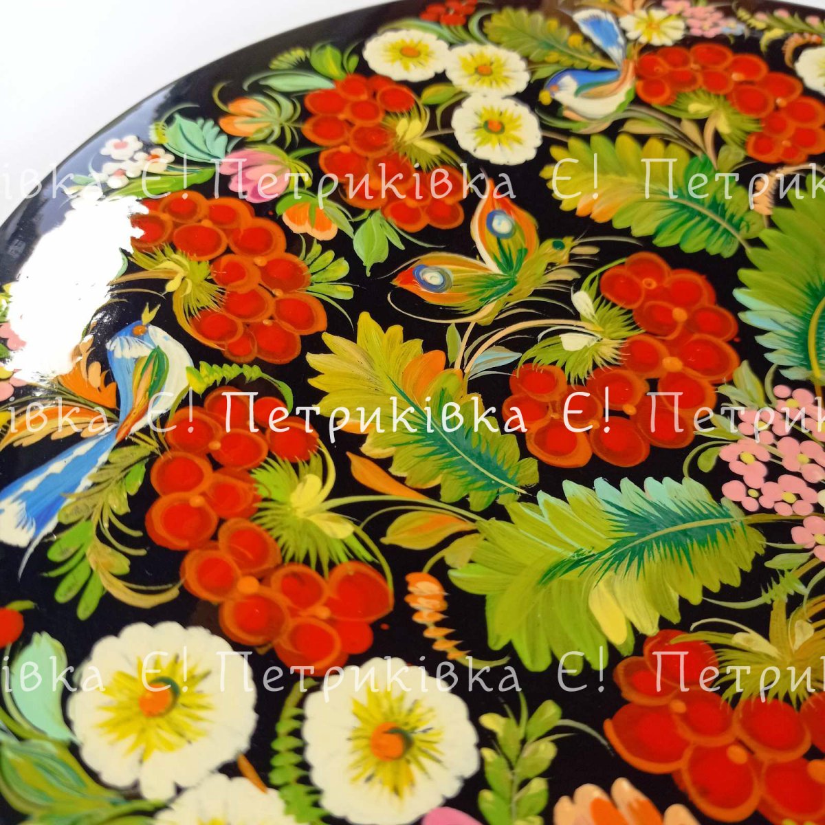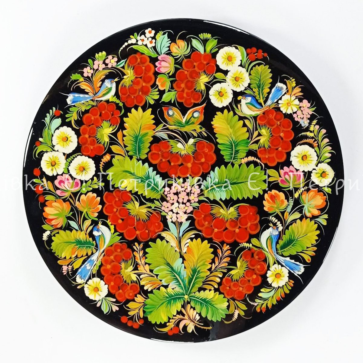 Тарелка с Петриковской росписью 25 см "Кукушки в калине, с бабочкой"