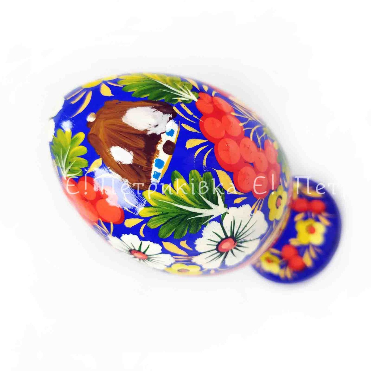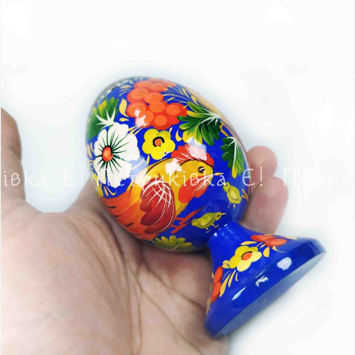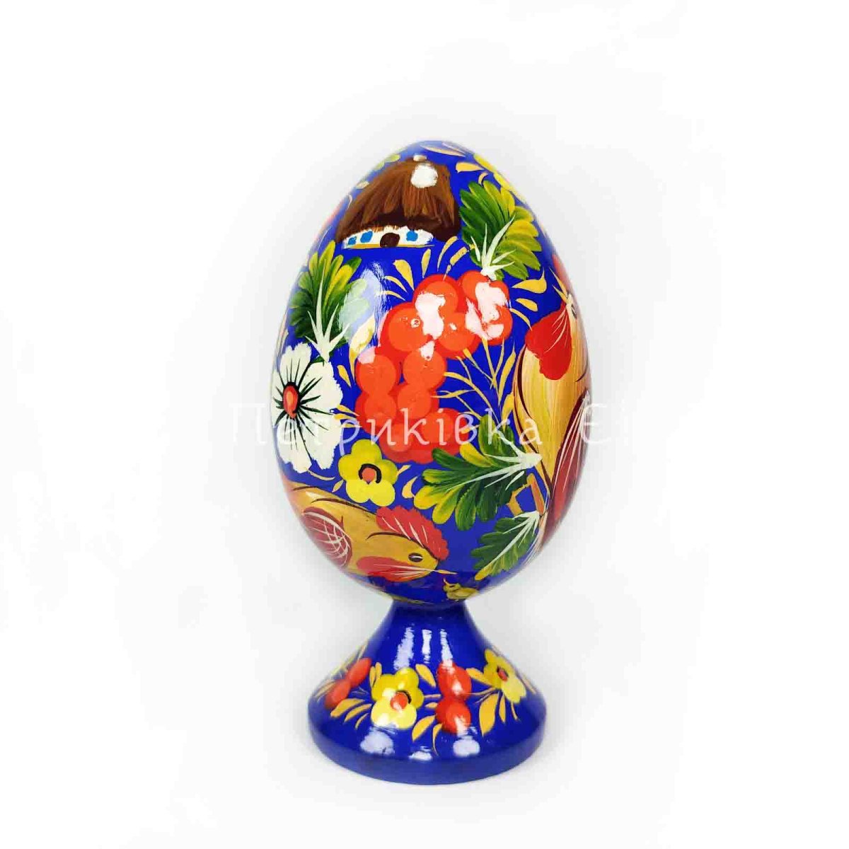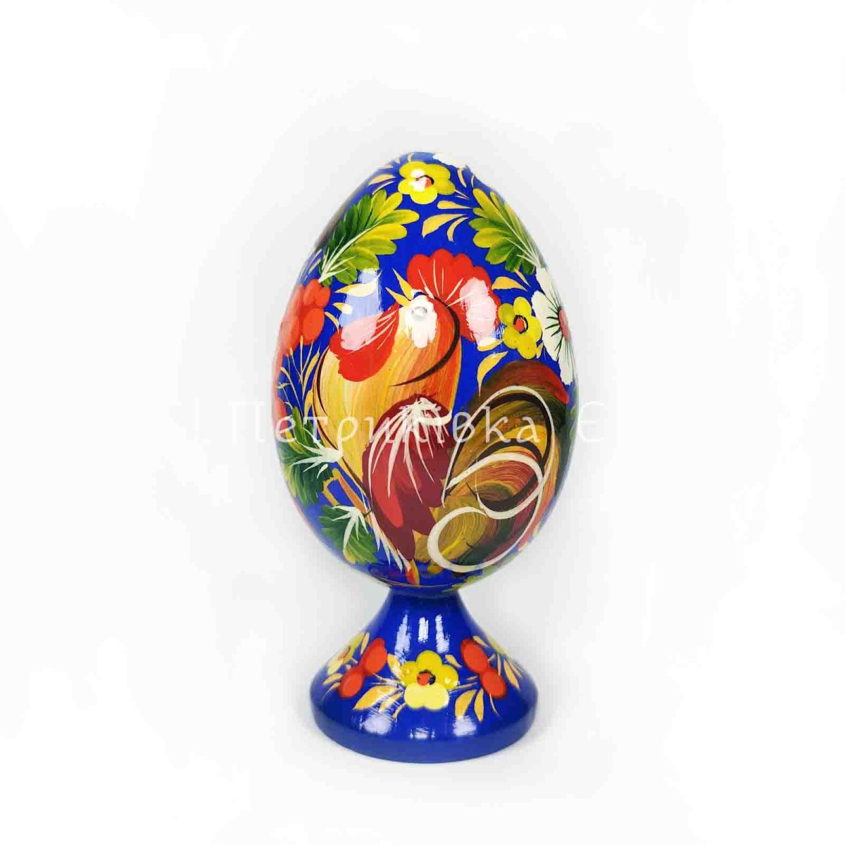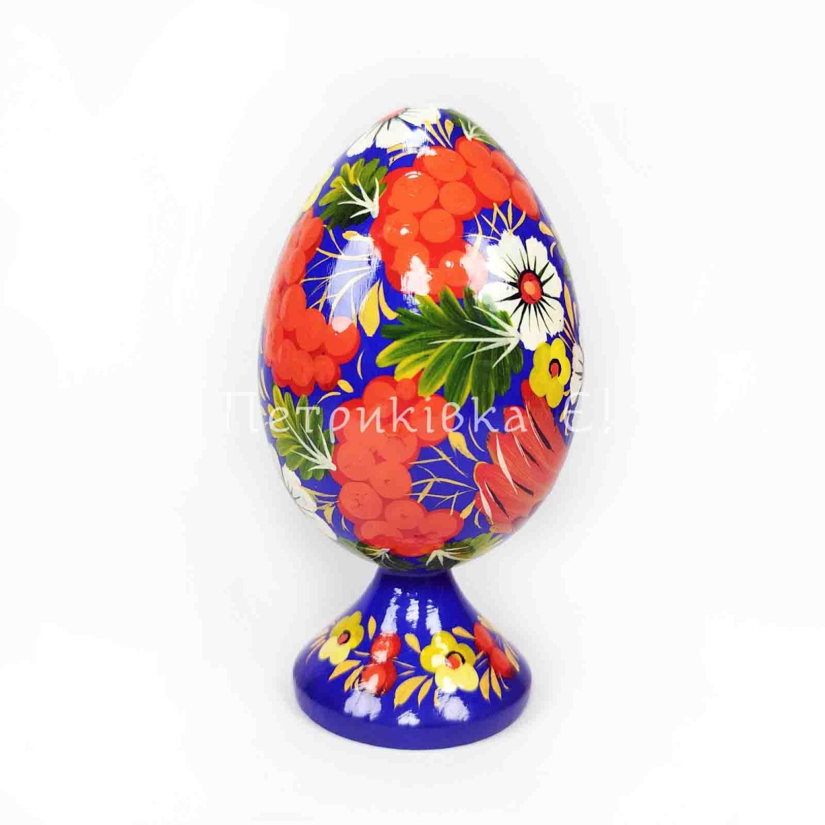 Яйцо (высота 12 см) с Петриковской росписью на ножке "Украинское село" на синем