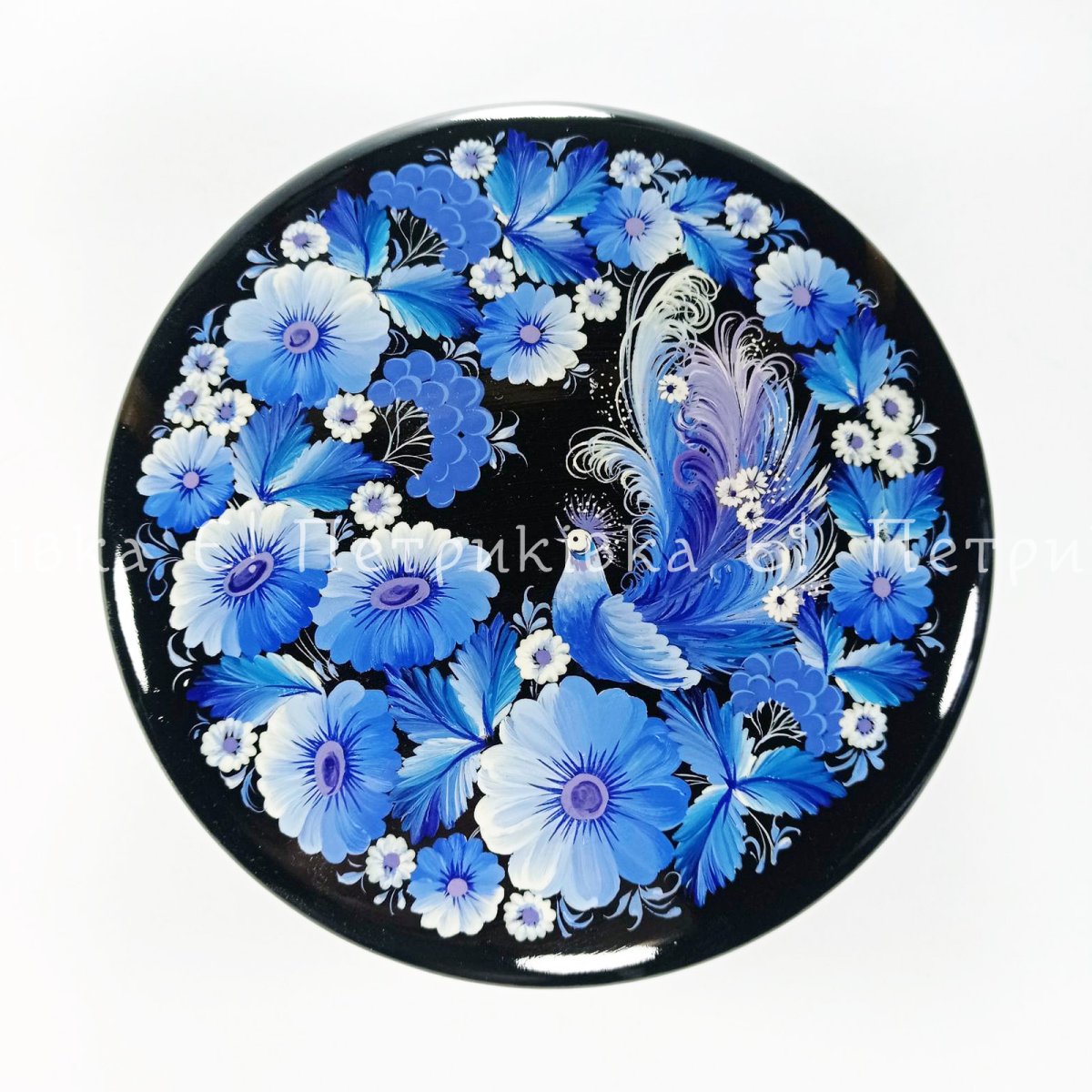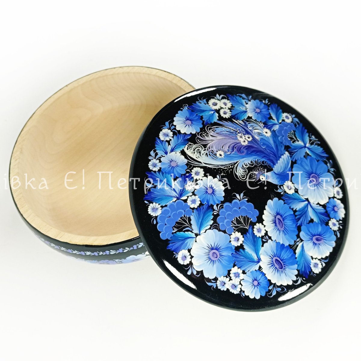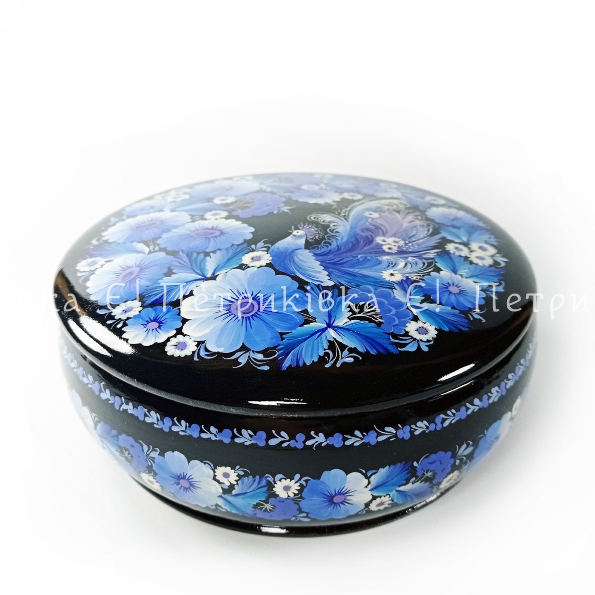 Шкатулка Петриківський розпис діаметр 15 см "Петриківська зимова Жар-Птиця" кругла