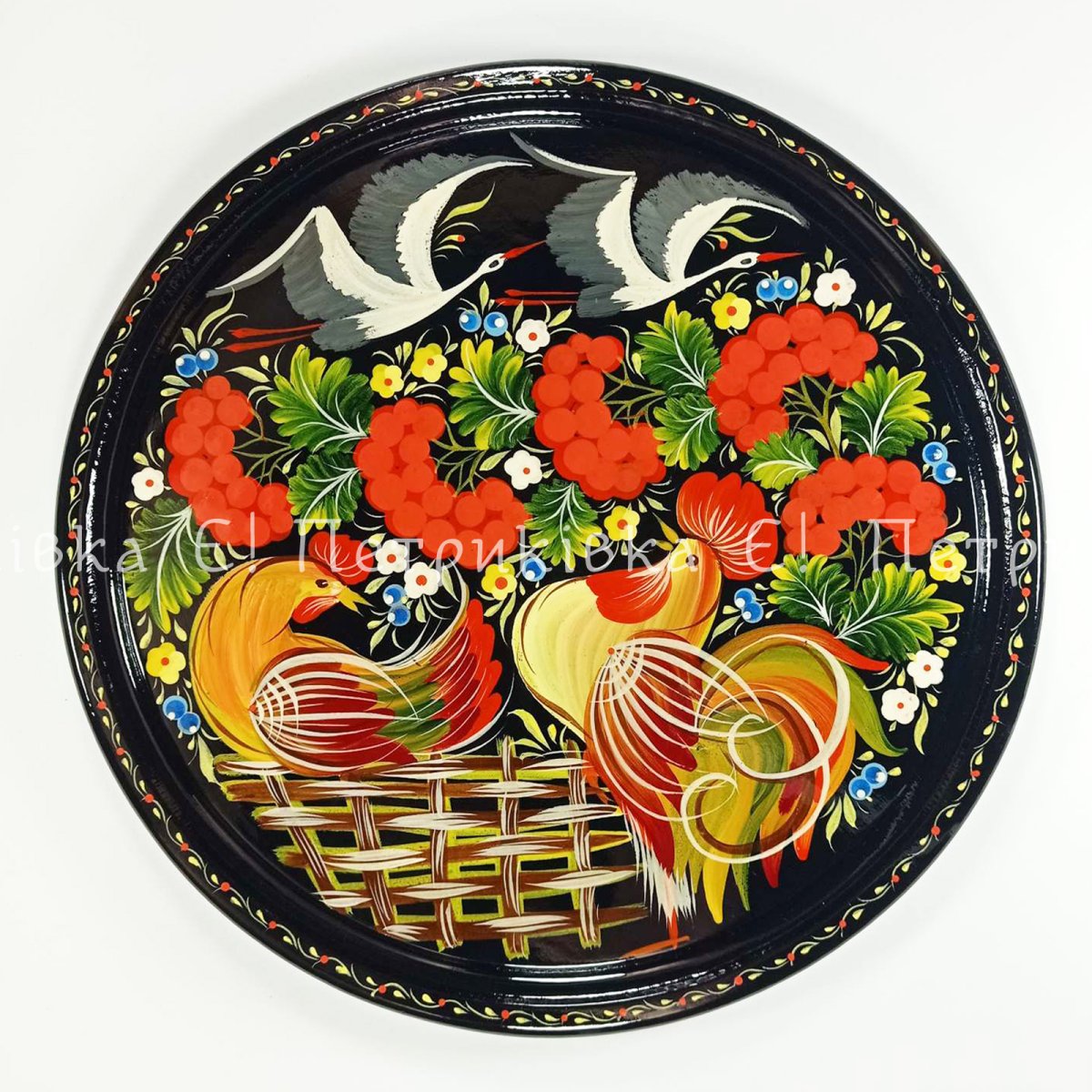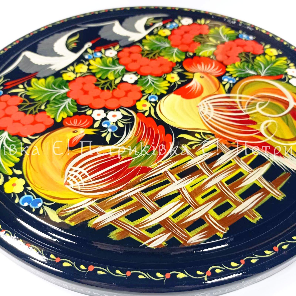 Панно петриківський розпис 30 см "Лелеки, півень та квочка на тину"