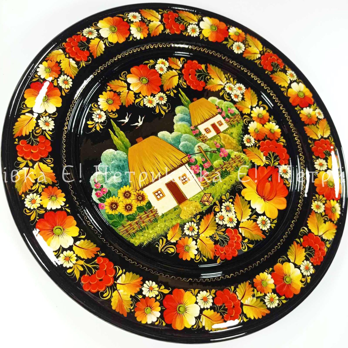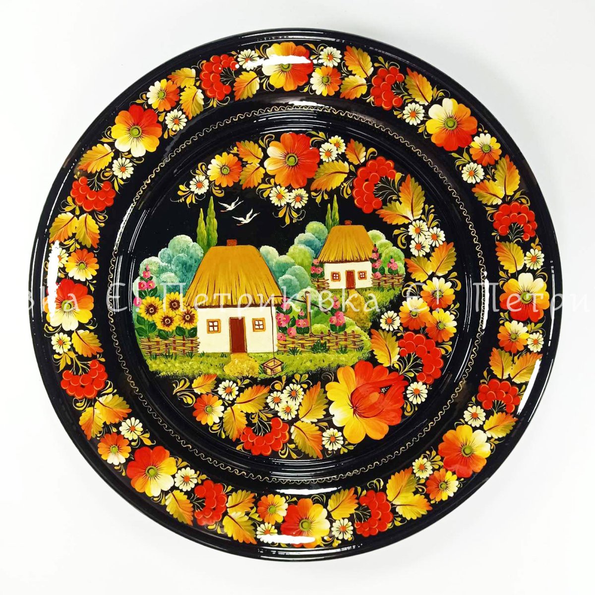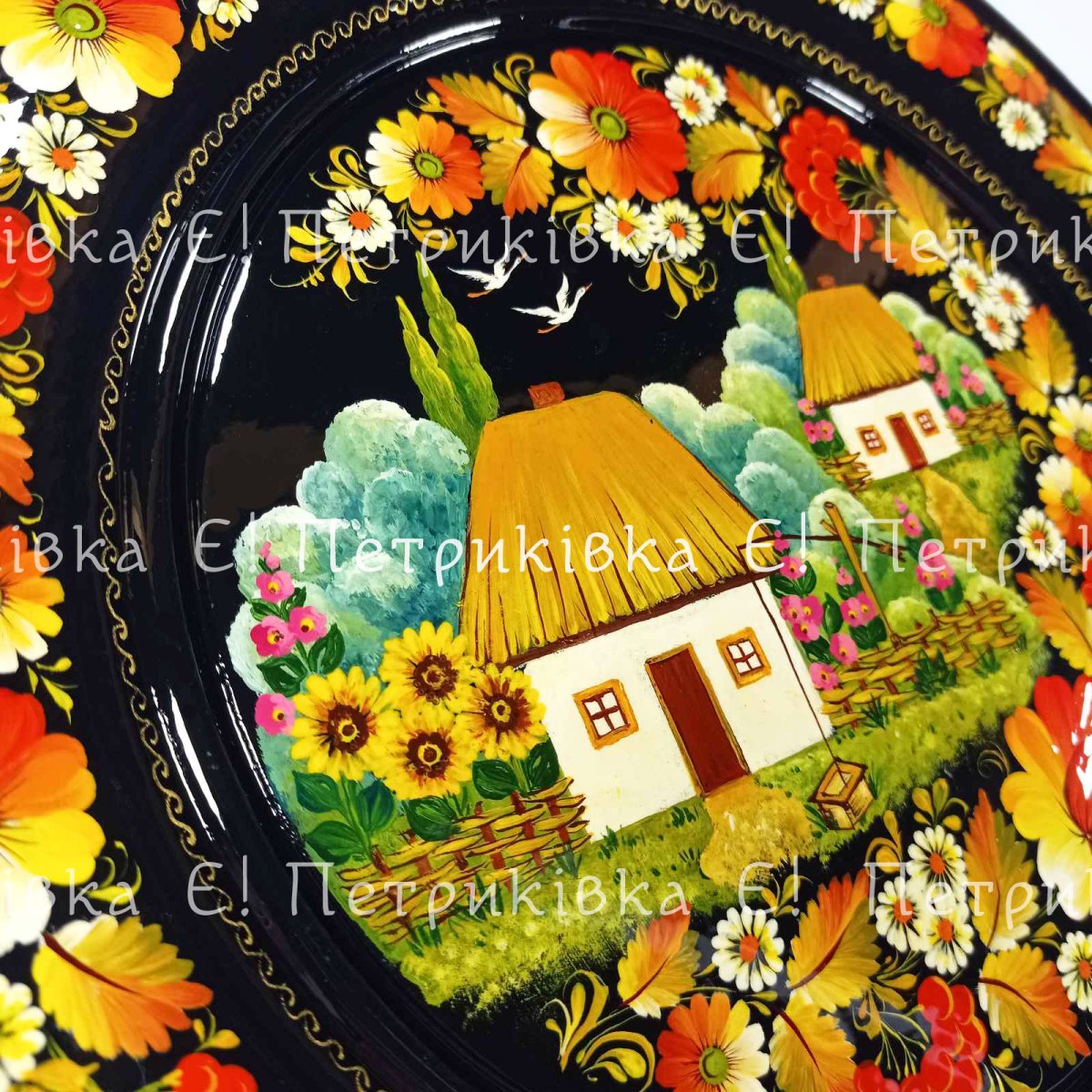 Тарілка з українським пейзажем в обрамленні петриківського орнаменту. Зроблено з деревини липи. Діаметр - 30 см. Розпис - масляні фарби, чотири слої лаку. На задній поверхні - підвіс