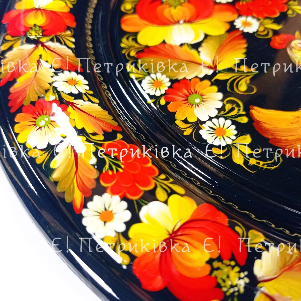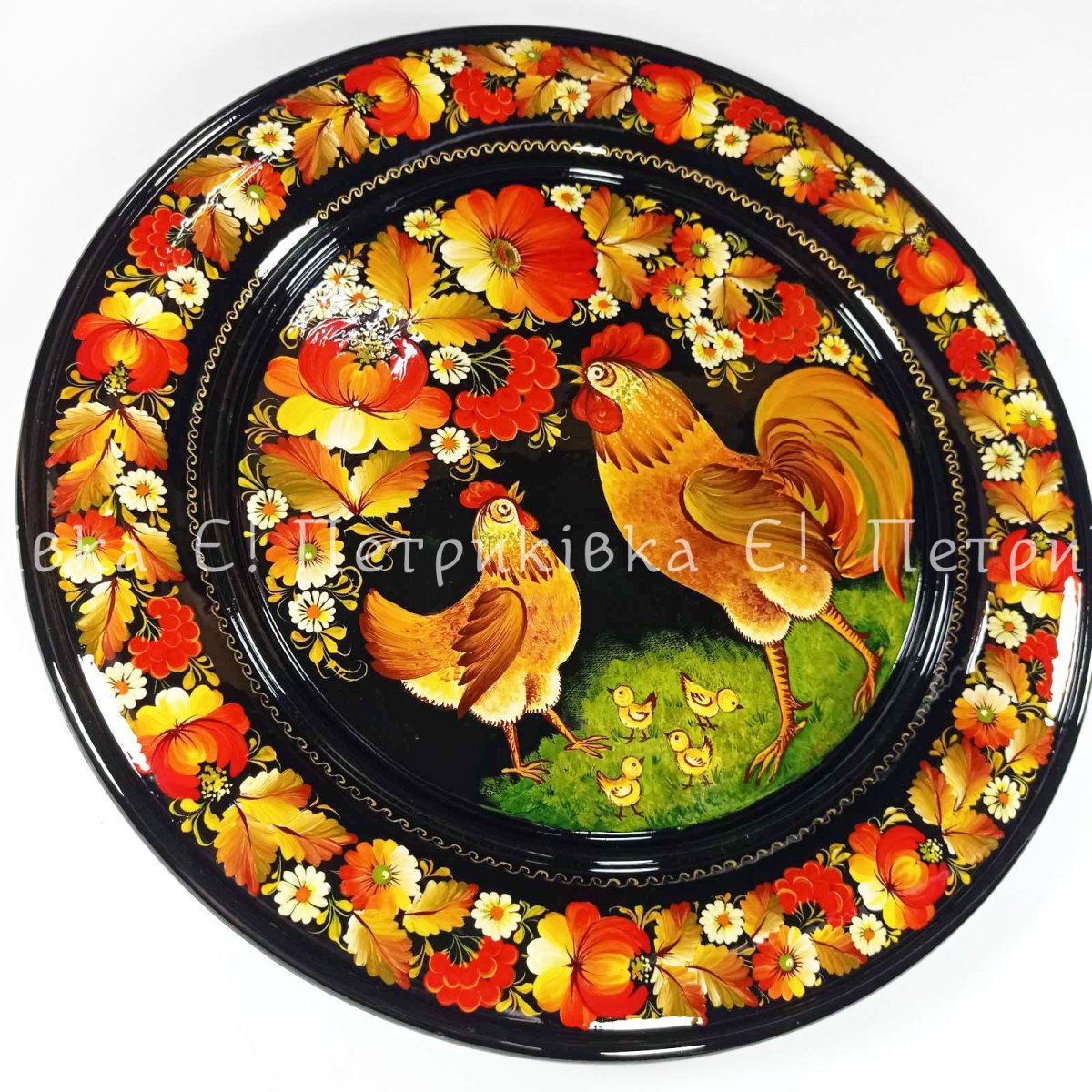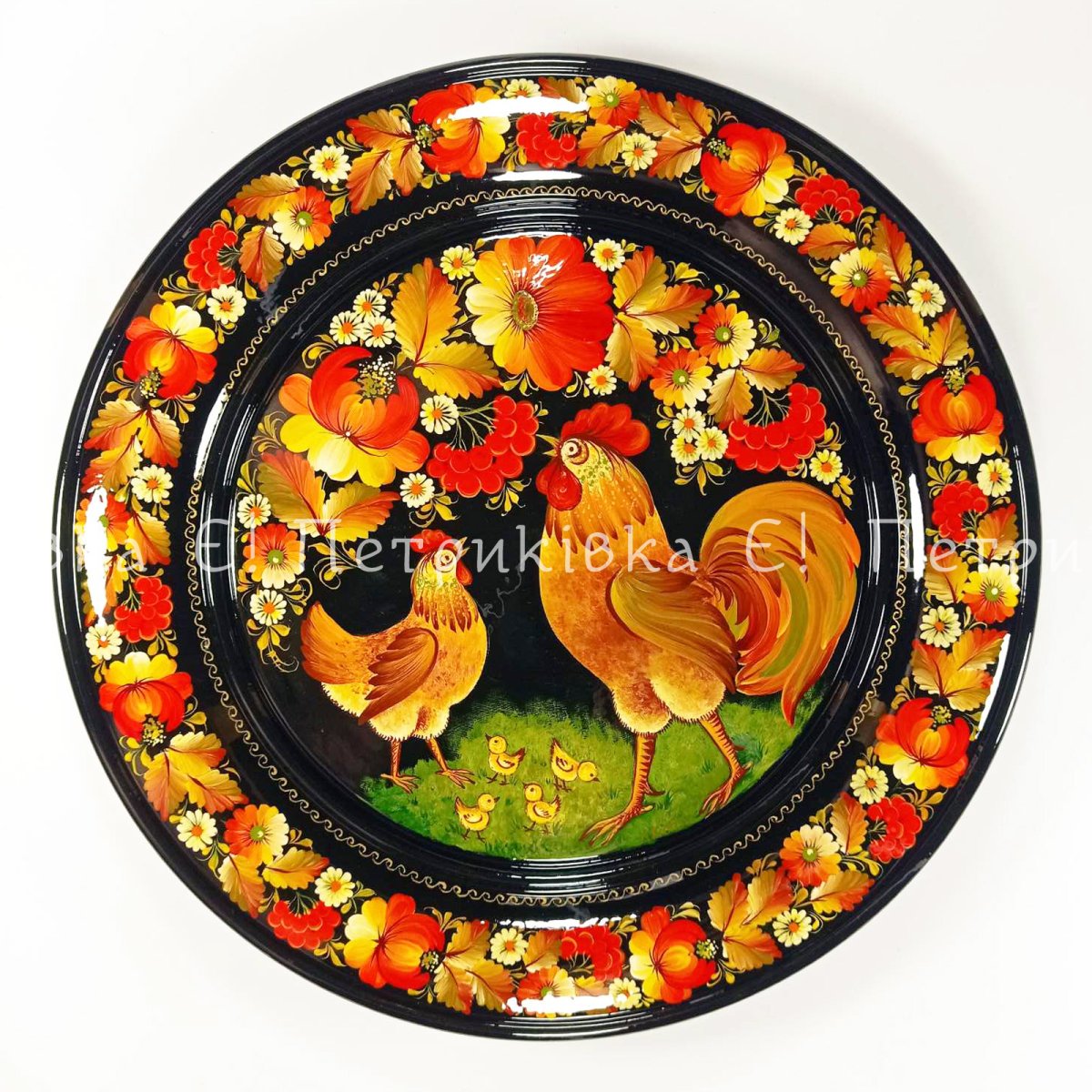Тарілка з Петриківським розписом 30 см "Півник, курочка та курчата"